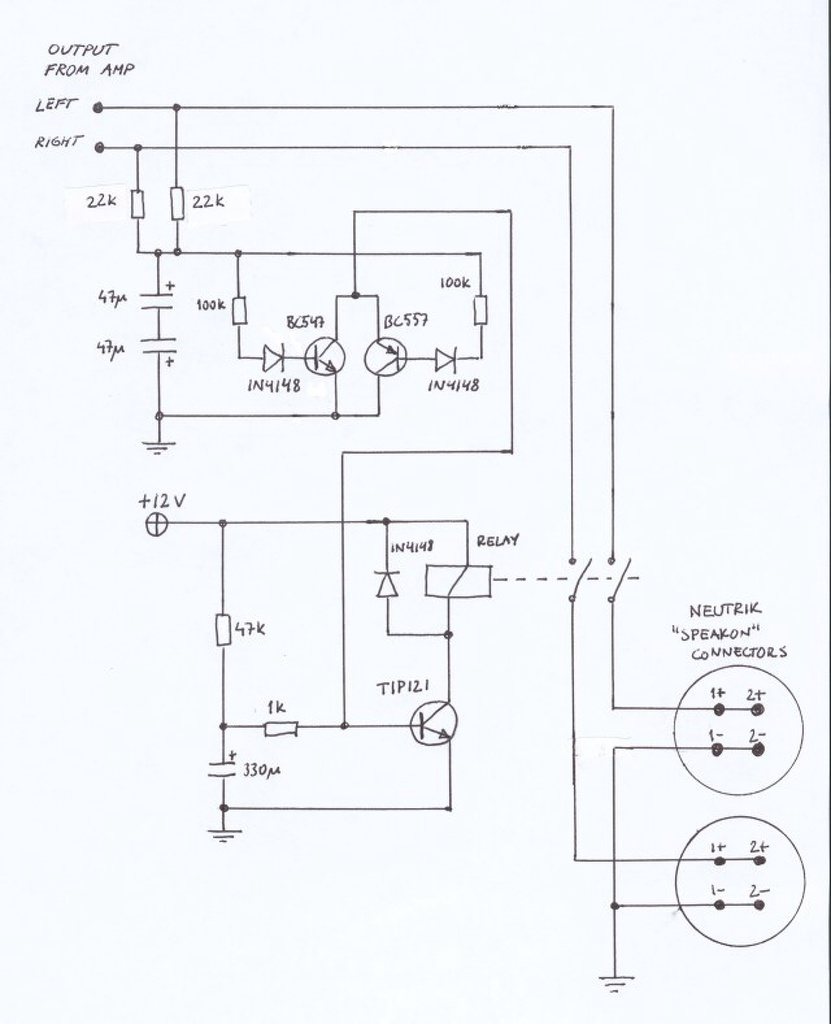 Az alabbi hangfalvedelmet kötöttem be az EA6383s erösitömbe. Bekapcsolas utan a rele nem huz be csak akkor ha a vegfokbol erkezö jelet ( bal-/jobb) kiforrasztom. Megmertem a vegfokbol erkezö vezetekeket elöször a GND-hez viszonyitva majd a +34v hoz viszonyitva. Az elsö esetben 0V-t mertem de a +34-hez kepest pedig -34V-ot. Nem tudom mi lehet a problema, a pozitiv taplalast a +34- re kötöttem, a minuszt a GND-re. Lehet hogy nem jol kötöttem be? Ugy tudom hogy egyaltalan nem szabad normalis esetben egyenfeszültsegnek lennie a vegfokok kimenetein. Egyebkent teljesen normalisan müködik az erösitö szepen szol nem melegszik semmi. Kerlek ha van valakinek valamilyen ötlete segitsen! Köszi elöre is!