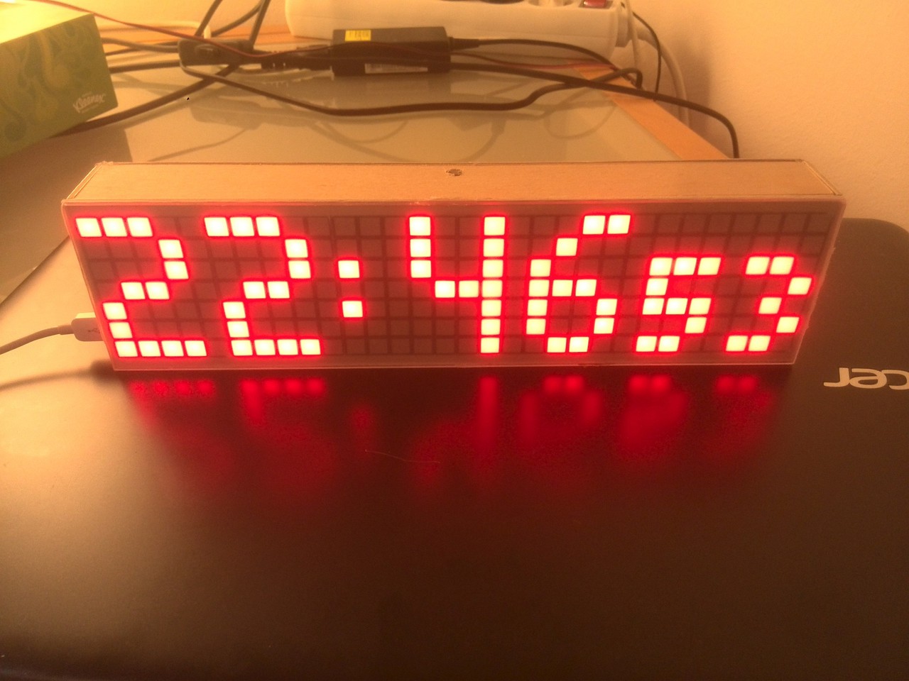 Zombee kezdte el fejleszteni H2opok támogatásával, én pedig megírtam rá a programot, kicsit itt-ott átalakítottam. 3 nyelven beszél, menüből minden beállítható, automata fényerőszabályzás, DS18b20 hőmérő, DHT-11 szenzor méri a páratartalmat.