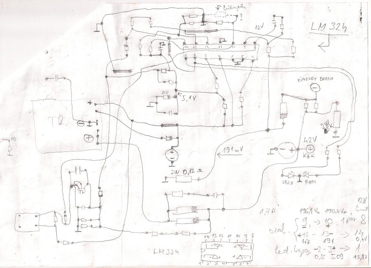 Hello Mesterek! Van nekem egy akksi töltőm. Az a probléma,hogy megmértem az LM324-es IC 9,10,és 8-as lábán a feszt,hogy megtudjam vissza szabályoz-e? (mivel előzőleg le volt égve a primer oldal UC3842, MOSFET,és még jópár ellenállás.Most működik,de a mellékelt rajzon jobb alsó sarokban leírtam a mért értékeket az említett lábakon. Közben 1.7 A-el tőlti az akksikat. Tehát a 9-es lábon(- bemenet) van 196.1mV. A 10-es lábon (+bemenet) 190.4mV. És ami fura hogy a 8-as lábon viszont 12V van. Ha leveszem az akksikat,akkor a 9-es lábon(-bemenet) 0V, a 10-es lábon (+bemenet)190.4mV,a 8-as kimeneten pedig 15.8 V van. Ez így normális,de ha akksikkal mérem akkor szerintem a 12 V a 8-as lábon az nem jó. Lehetséges hogy hibás az LM324? Vagy az a 6mV különbségnél a bemeneteken a 8-as lábon a fesz még nem billen át? Nagyobb különbség kell?