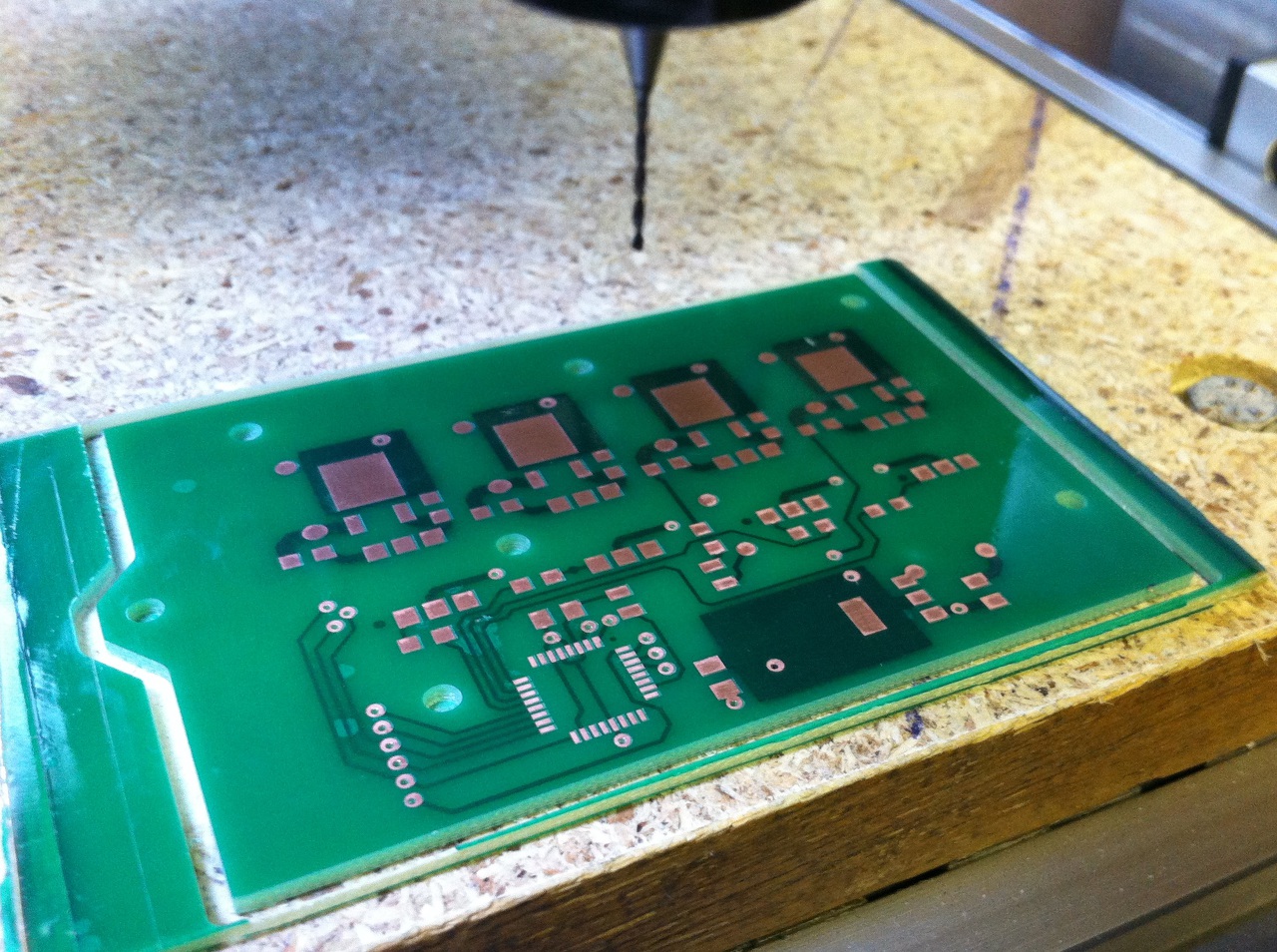Sajnos a kamerás pozicionálás - leginkább anyagiak miatt - eddig nem jött be, így marad a szemem, megtoldva egy két optikai segéd eszközzel (szemüveg, nagyító, stb.) Minden nyákot maratás után, utólag fúrok, és egész könnyedén, meglepően pontosan be lehet állítani a x0 y0 pozícót és az elforgatást is.