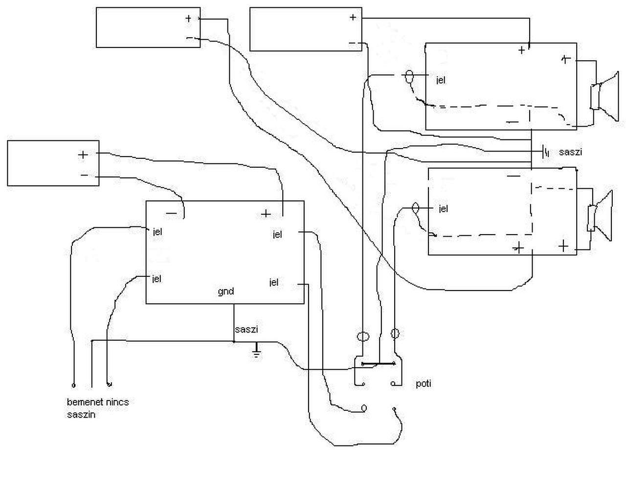 Nálad a jel útja közös egy ponton a tápárammal, amiben benne van még a kimenő áram is a hangszóró felé. Pirossal jelöltem a jel szempontjából problémás részt.