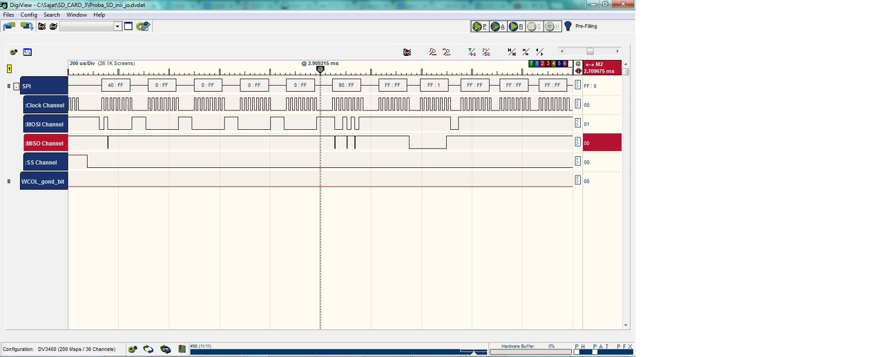 Táp felkapcsolása után fCLK=250 kHz, ebből CS=1 mellett 96 impulzus ( elvileg bőven elég!), majd CS=0 és CMD0. erre válasz=1 ( ez szerintem jó!). Ezután CMD8 (0x48,0,0,1,0xAA,0x87), erre a válasz: 0,0,0,2,31, ami szerintem nem jó, mert elvileg itt meg kellene ismételnie a 0xAA-t ! Az adatlap szerint, ha nem jön vissza a 0xAA, akkor nem jó a kártya ( de a laptop simán használja !) !
