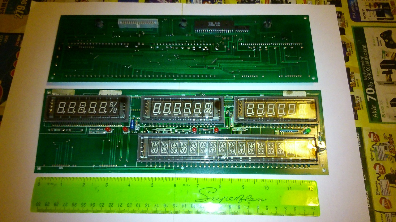 Van 2 db teljesen egyforma panelem amelyek a képeken is láthat különböző VFD kijelzőket tartalmazzák. Állítólag digitális bolti mérleg kijelzője volt. Ha valaki tudna felvilágosítást, felhasználási javaslatot adni vagy esetleg ismeri ezeket a típusokat (a hátoldalukon lenne típus és a gyártó csak én nem akarom egyenlőre szétbontani) akkor minden információt szívesen veszek és megköszönök előre is. Esetleg, ha valakit érdekel akkor szívesen lemondok róluk valami rádiós vagy arduinos cuccért cserébe (2 db VEF206, 2 db kapcsolós enkoder)