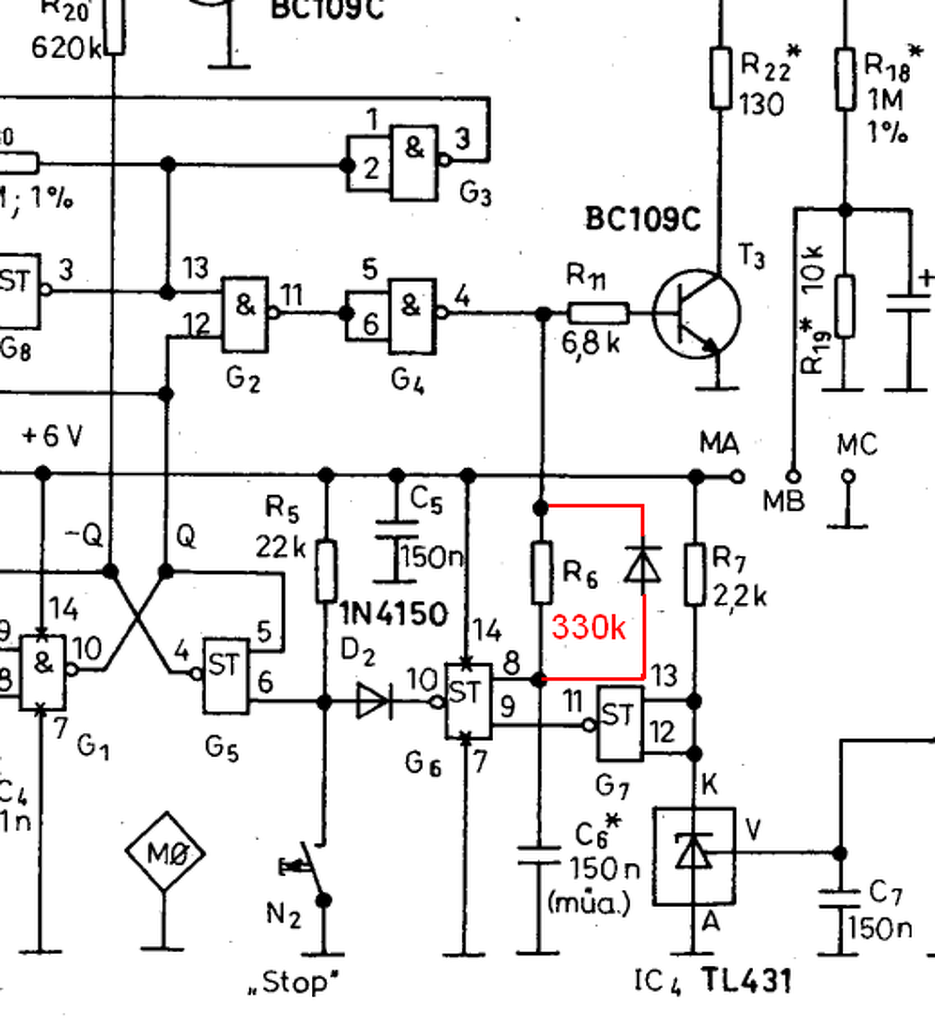 Nos, ezt a kapcsolás nem teljesíti. Hiszen a kisütés megkezdődik, mikor G4 kimenete magas szintre vált. A figyelés kapuzását pedig a G6 végzi. A kettő között van az R6/C6 integráló tag. Ennek késleltetésének kellene biztosítani, hogy a G6 kapu, csak a kisütési félperiódus vége felé legyen nyitva. (A kapcsolásban az R6 értéke el is van írva, mert a 620ohm helyett annak értéke az alktrész lista szerint 620kohm.)