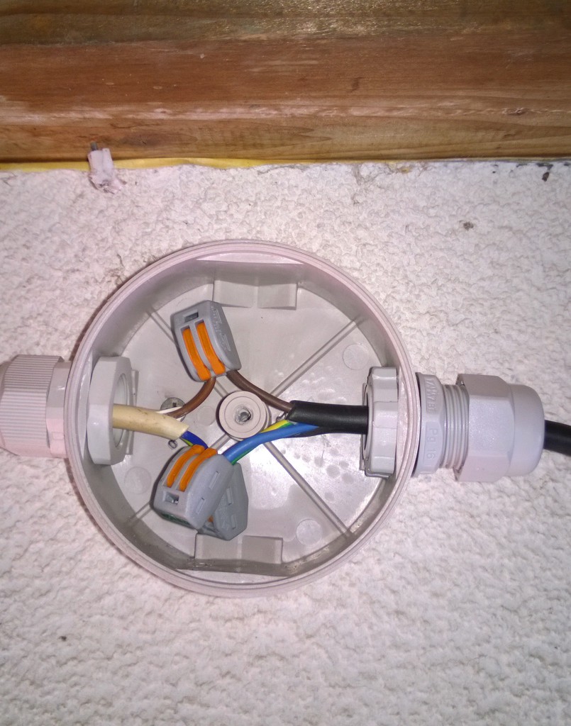 A jobb oldali tömszelencét szorítsd rá egy kicsit jobban, és tegyél egy fedőt a dobozra. Egyébként szabványos kötés. A vezeték ugyan nem nagy keresztmetszetű (látszatra 1mm2), ezen maximum 10A lehet áthajtva.