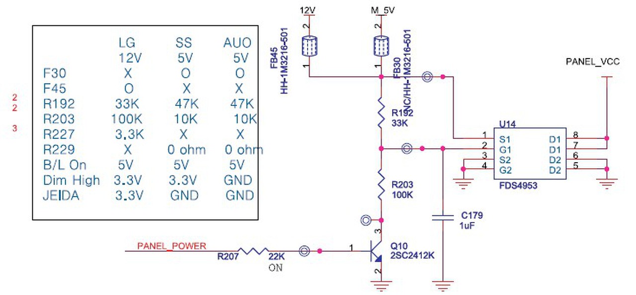 A panel power a BLON, írtam is, hogy a kimenettel nyitod a tranzisztor bázisát (a tranzisztort csak felismered). A panel_vcc a FET "kimenete" tehát ott fog megjelenni a tápfesz. A táblázat rád is vonatkozik, mert ha 5V a táp amit kapcsol, akkor kell a táblázatban jelzett ellenállás értéke, ha 12V, akkor pedig az annak megfelelő, de egyébként az is van a rajzon 33K. A körök csak mérőpontok. Ezzel a megoldással kapcsolhatod a tápfeszültséget az egész ledes megoldásnak, amit ne nevezz PWM-nek, mert félreérthető, hogy hogy szabályzod a fényerőt, az itt most lényegtelen, nevezzük terhelésnek, fogyasztónak.