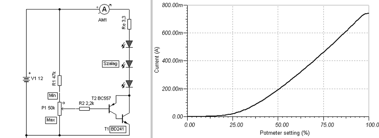 Ha van egy PNP tranyód (szinte bármilyen) akkor készíthetsz vele egy komplementer darlingtont. A BD241-től 500mA kollektoráram környékén, kb. 100-as béta várható. Így 5mA bázisáram igénye van. Ha a PNP tranyó bétája 200 körüli 5mA mellett, akkor ennek bázisához 25uA áramra van már csak szükség, hogy kivezérelje a BD241-et. Mivel most a negatív oldalon szabályozunk (mert azt szeretnéd) a poti fordítva szabályoz, akkor lesz a fény maximuma, mikor a csúszka a testen van. A poti felett az R1 csak azért szükséges, hogy a poti ne csak a végén szabályozzon. Hiszen egy emitterkövető, követi a bementi feszültséget, a Led-ek meg nem nyitnak ki addig, míg meg nincs rajtuk a nyitófeszültség. Az R2-őt azért tettem bele, hogy véletlenül se tudd tönkre tenni a potit, ha rosszul kötöd be. (Az Re és a három Led, csak modellezi a szalagot.) Remélem így már boldogulsz..