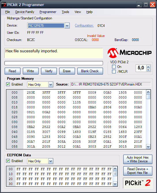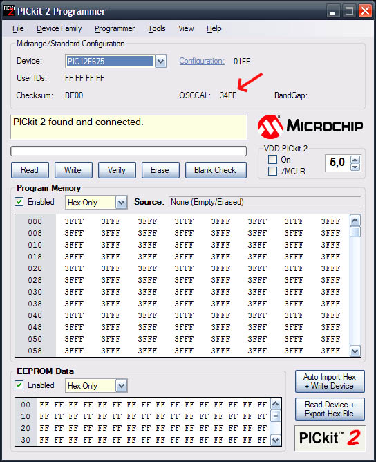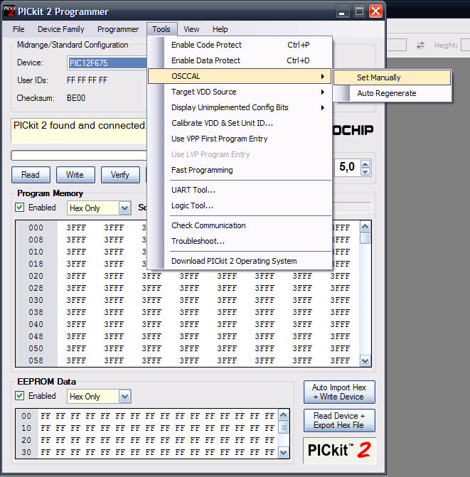 Azt tudni kell, hogy a generálásnál a PIC tartalma törlődik, tehát a generálás után a hex-et újra be kell programozni neki. A PICkit2 programozáskor figyel rá, hogy az OSCCAL érték a helyén maradjon, tehát ha egyszer bekalibráltad, vagy kézzel beállítottad, akkor utána már nem fog eltűnni onnan, ha a PICkit2 progival dolgozol.
