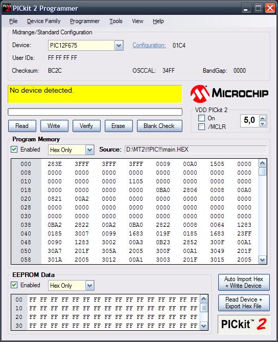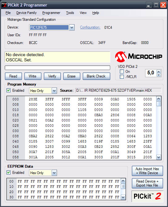 A folyamat, amin végigmentem: 1. Pickit2 csatlakoztatása 2. Szoftver elindítása 3. Communication check (ok) 4. ICSP csatlakozó csatlakoztatása a próbanyákra 5. Eszköz kiválasztása (PIC12F675) 6. File menü - Import Hex 7. Kiírja, hogy ugye baja van az OSCCAL résszel 8. Megpróbálom az auto regenerate opcióval helyrehozni, de sikertelenül 9. és utána előjön az, amit még sosem láttam: a hibaüzenet_2.jpg-ben látható, hogy mélysárgára vált az ablak középen, és kiírja, hogy No device detected, pedig az ICSP csatlakozó változatlanul a próbapanelra van csatlakoztatva. Valaki meg tudná mondani, mi a gáz? Magára az eszközre gyanakszom, mert ez egy Pickit2 klón, de lehet hogy csak én vagyok ennyire antitálentum.