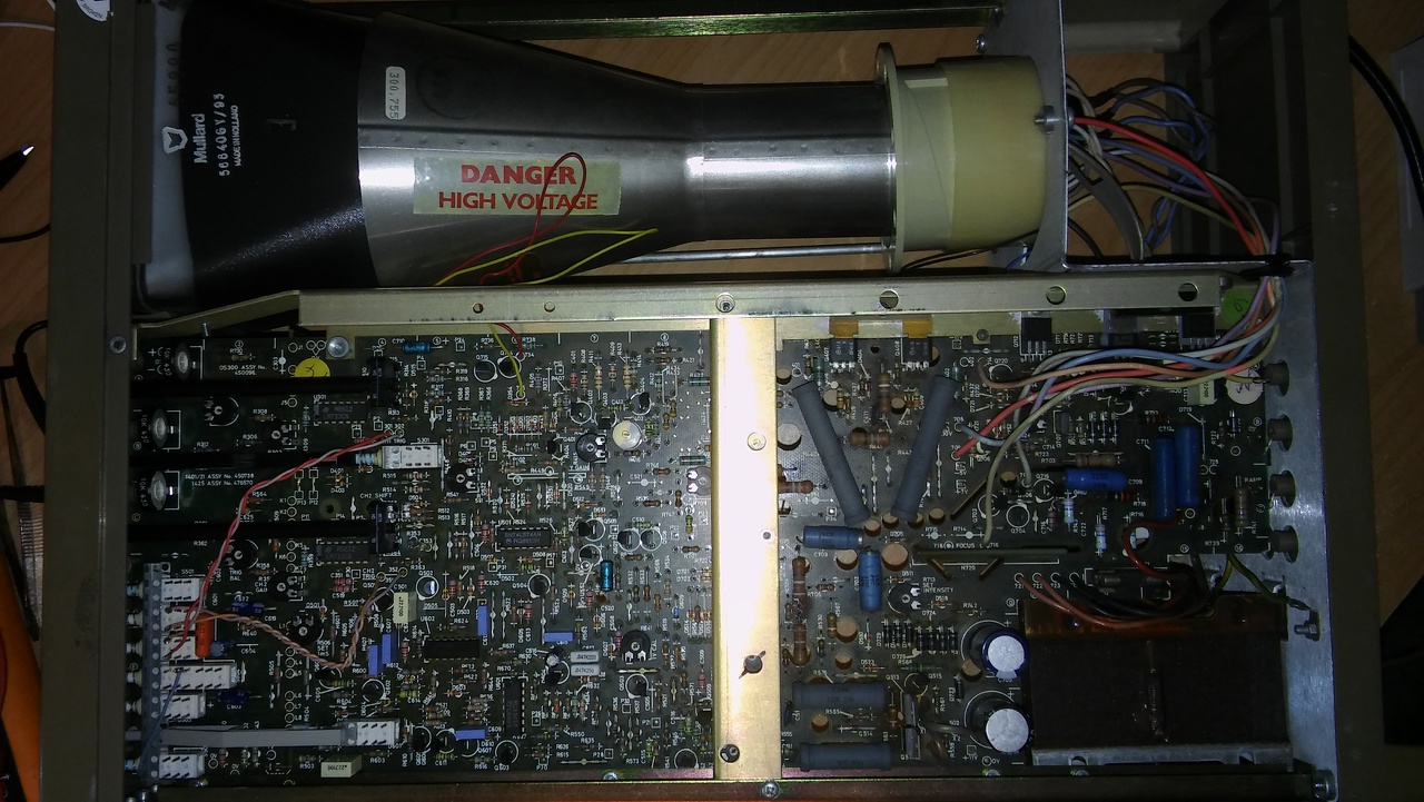 Mondjuk annyira nem sürgős a javítás, szeptembertől tanulom az Elektronika tárgyat villamosmérnökin, ahol elsőnek mélyedhetek el a félvezetők lelki világában, talán utána nem leszek ilyen Süsü egy év múlva ugyan ekkor, viszont most azt sem tudom, mit mérjek szegény háromlábún. Találtam pár nem olyan szép nyomot, hogy volt már javítva, a videón megjelölt Forró pontok alatt, a tranzisztorok alul lógnak a levegőben, egy lábuknál sincs ép NYÁK szakasz, át lettek hidalva. Ha már ott voltam, szépítettem rajta kicsit, de a hiba változatlan, szóval nem ott volt megszakadva. (Igaz, a tranzisztorok mellett X1 és X2 pontokból ment a vezeték a CRT felé, nem is tudom, mit vártam...) Küldtem egy képet a panelről. Az a gond, hogy ahogy nézem, egy szám sem stimmelt a rajzon és a panelen, már ami a CRT bekötését írja. De feltételezem, hogy a piros-sárga érpár vezet az Y erősítőhöz.