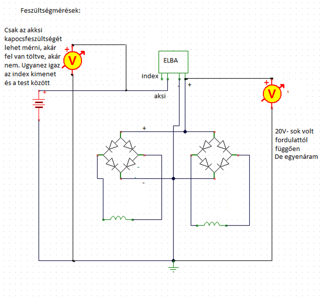 Mértem feszültséget. A bemeneti lábon és a testen, az Garetz hídből kijövő egyenáramot mértem (20V-sok V-ig, fordulattól függően). Elsőre úgy tettem össze, hogy bár a Garetz hidak össze vannak kötve párhuzamosan, de csak egy tekercset kötöttem rá. úgy is ezt a feszültséget mértem, de egyébként az ELBA-ból nem jött ki áram.