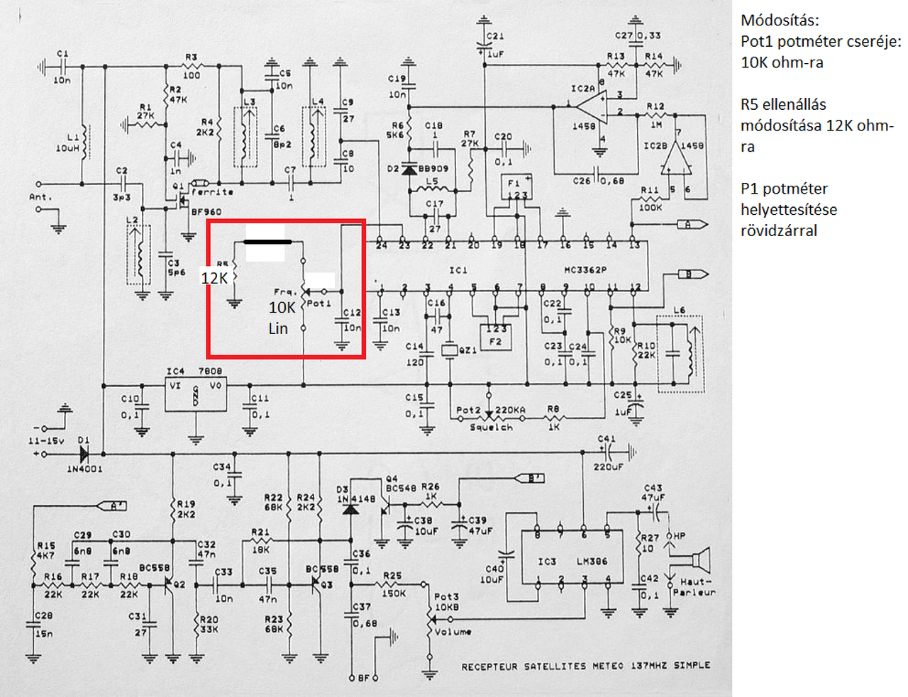 A másik, a topikban már sokszor említett "francia műholdvevő" : Bővebben: Link. Ez is elindult elsőre, erről készítettem egy rövid videót is: Bővebben: Link Viszont az IC 23-as lábánál módosítottam a kapcsolási rajzon (lásd: melléklet, pirossal jelöltem), hogy kicsit csökkentsem az oszcillátor átfogását. Így most nagyjából 136,6MHz-től 138,1MHz-ig lehet hangolni, ami teljesen bevált (frekvenciamérővel ellenőriztem). A kérdésem ehhez annyi lenne, hogy ettől a módosítástól függetlenül azért még továbbra is rendesen fog működni az AFC áramkör (MC1458-as IC) ? Tehát ezzel nem rontottam el semmit, csak a sávátfogást csökkentettem? |