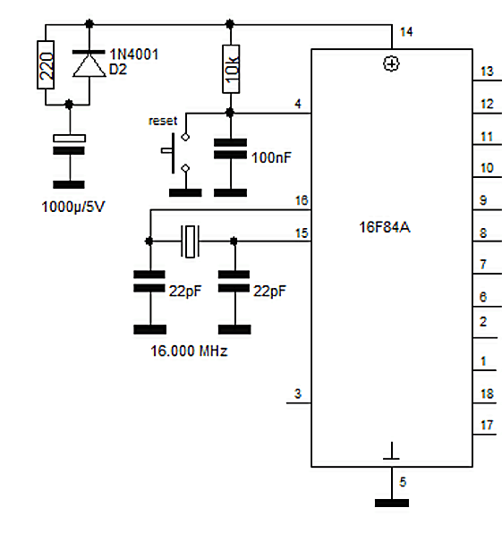 Inkább úgy kellene csinálnod, hogy a pic a tápot egy schottkyn (vagy adott esetben sima diódán) keresztül kapja, és a kondenzátor párhuzamosan van a pic-el. A kondenzátorral sorba felesleges ellenállást tenni, azt a kis áramlökést bekapcsoláskor mindennek el kell viselnie, illetve a meredeken ugráló táp sem jó, a kondenzátor valamelyest lefogja a hirtelen változásokat.