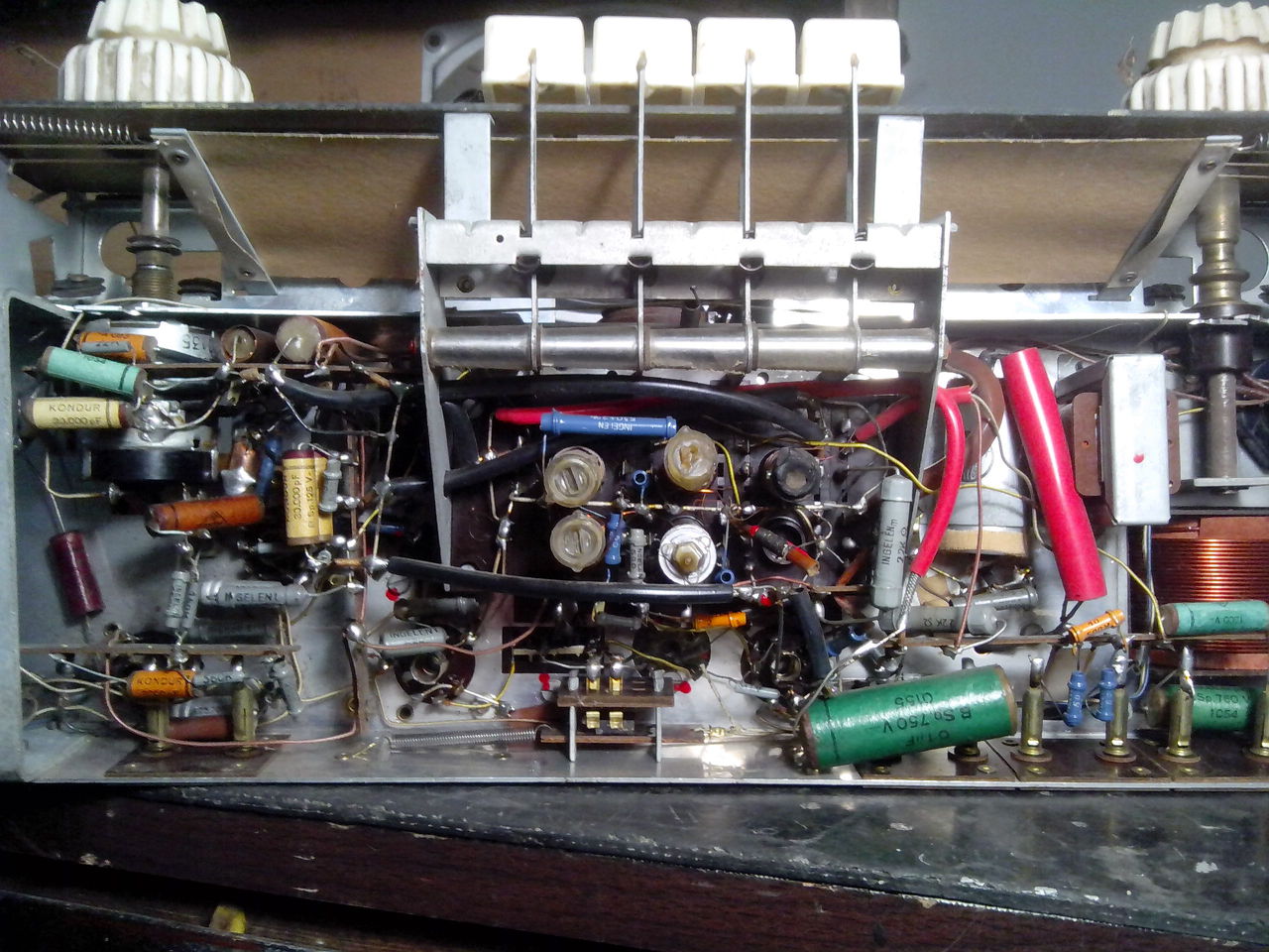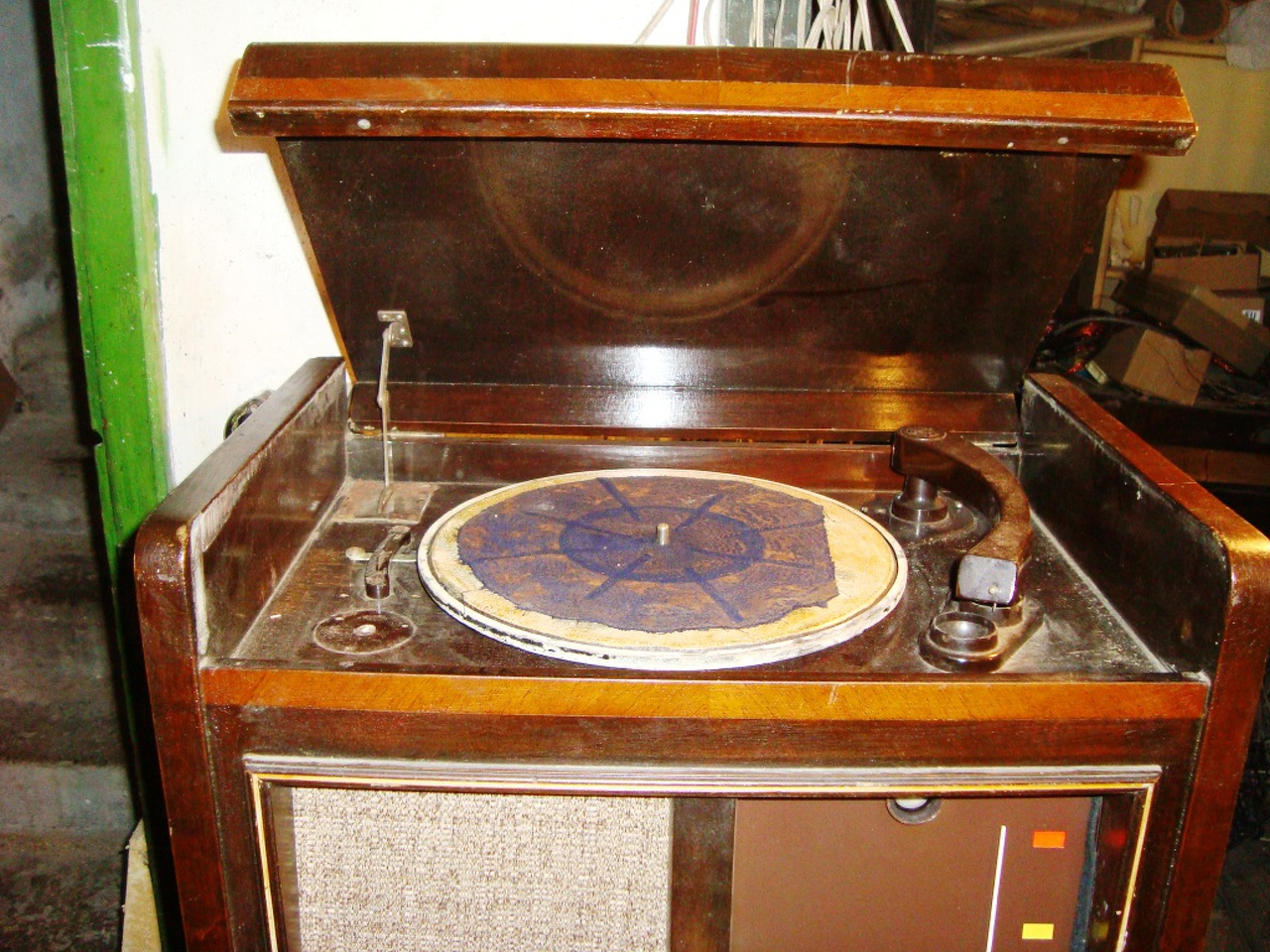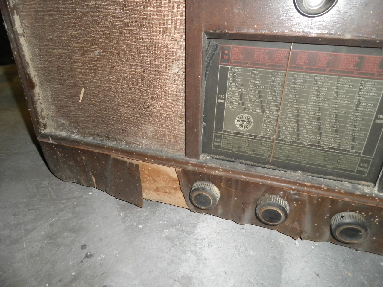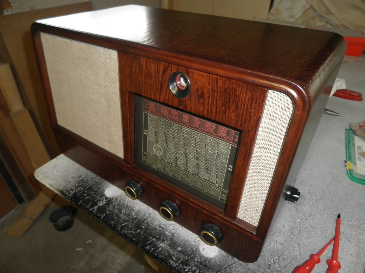 Kívánságod parancs! Ime egy 1943-as évjáratú Orion 255G. Valaki már elkezdte a felújítását, úgy került hozzám. Kicserélték a selymet, vettek új üveget, meg szétszedték az egészet, de ebbe ki is merült a tudomány. Egyetlen cső nem volt benne, menthetetlenül rozsdás volt a panelja, és igen rossz állapotban van a gramafon, meg a doboz is. A panelről leszedtem a leszedhető dolgokat, kimaszkoltam, és lefújtam ezüsttel, a hál. trafót feketével, a skála tartót meg barnára. Eddig csak a "dizájn" van meg, még nem kapcsoltam be. A dobozt egyébként is csak akkor tudom megcsinálni, ha jobb lesz az idő, mert csak kint tudok chromofagozni, meg lakkozni. Tehát a következő feladat a panel életre keltése. A többi a képeken.