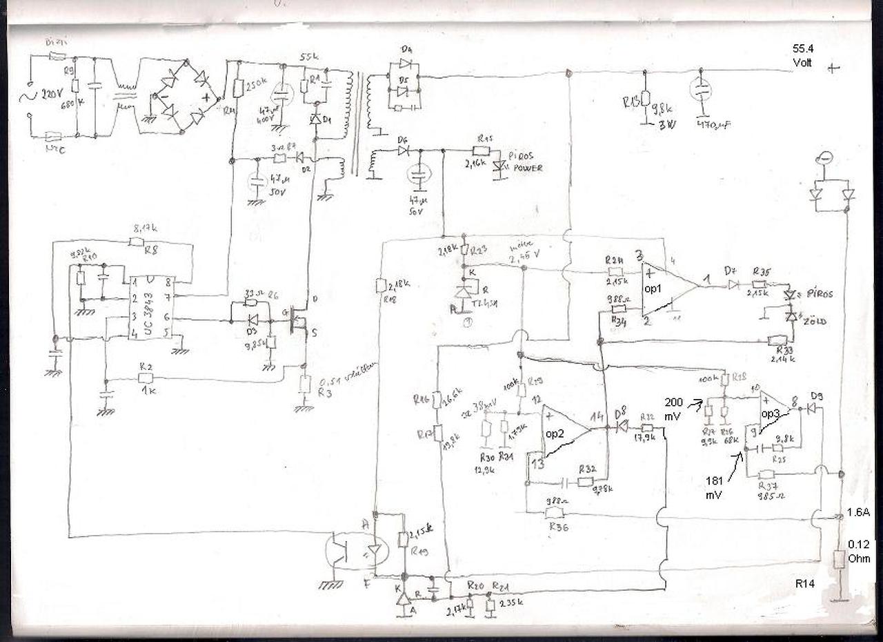 Hello! Van a képen látható akksi töltőm elektromos kerékpáromhoz. Azt csinálja,hogy bekapcsolás után elkezd gyorsan villogni a piros,és zöld led egyszerre. A puffert cseréltem-semmi változás, A 3843 7-es lábán kondit cseréltem-semmi. Az 55 Voltos kimeneten kondit cseréltem-semmi. Egyedül még nem cseréltem a D6 dióda után lévő 47 mikros kondit. Ez okozná? Próbáljam cserélni?Szerintetek mi lehet a baj?
