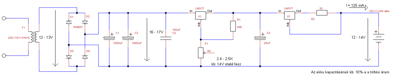 Hello! Az LM317 adatlapján találsz egy kapcsolást, ahol a feszültség szabályozást egy 317 végzi, az áramkorlátozást pedig egy tranyó, de ez is a 317-et szabályozza. A töltőáramot ugyan is soha nem kell oly pontosan szabályozni, mint a töltési végfeszültséget.