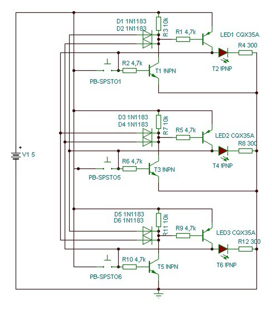 Sziasztok, olyan egyszerű kapcsolást keresek, ahol 3 nyomógomb 3 ledet működtet, mindegyik gombhoz tartozik egy led, amelyiket megnyomom, az a led világít, a többi nem. Találtam bistabil multivibrátor rajzot, de ott 2 gomb volt 2 leddel. Nekem pedig 3 kellene.