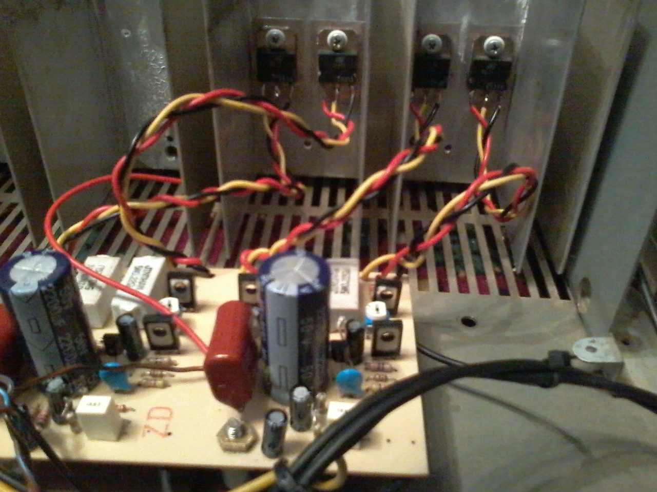 Sziasztok! Sikerult beinditanom a panelt.A trimmer jatszott velem Soos Csaba kollegank segitett hogy nezzem meg, es tenyleg az volt a ludas. A diodakat felrakom akkor a tranzisztor tokjahoz hovezeto pasztaval es pillanat ragasztoval vagy kitalalok valamit. Most perpill szepen mukodik az erosito.. Mivel ejszaka van nem lehet dubogtetni de reggel megkuldom.