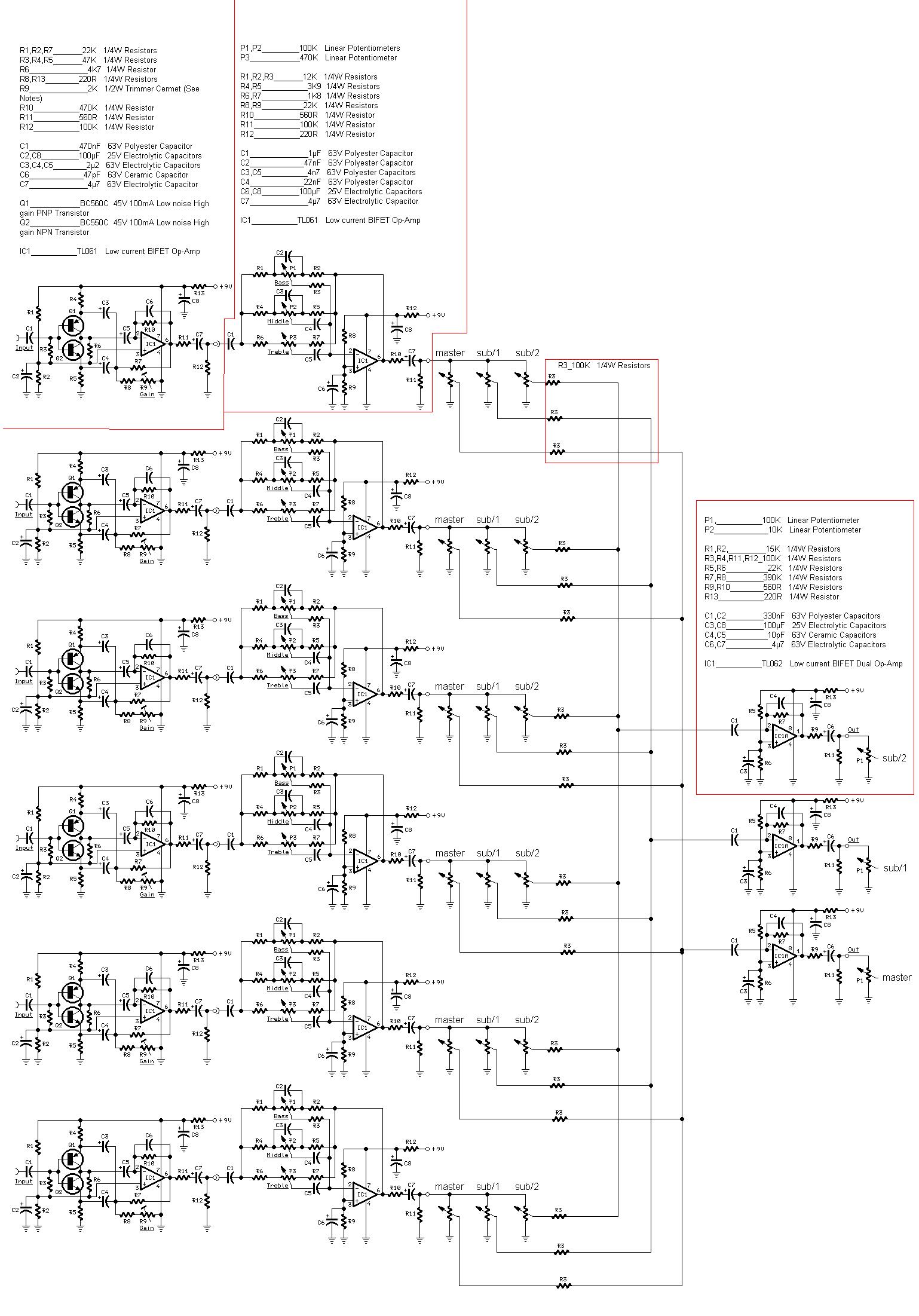 Idézet: „Ja és még valami! Hallottam hírét, hogy így befolyásolják egymást a potik. Mennyire befolyásolják egymást? Nagyon észrevehető? mert akkor tenni kéne vele valamit. ” Nagyon! Ez a rajz elhibázott. A 3db. keverő fokozatban (ahogy Te hívod "végfok") a C1 utáni R3 ellenállások helyett rövidzár kell. Viszont minden poti (master-sub/1-sub/2) csúszkája után be kell tenni ezt az "R3-at". (Tehát 18db "R3" lesz) üdv! proli007
