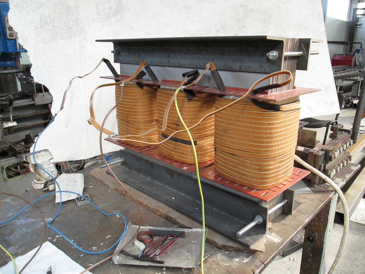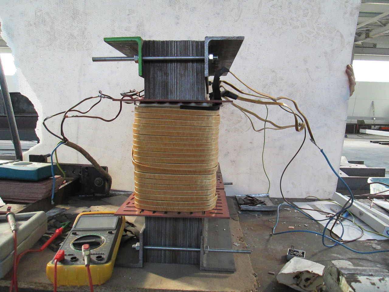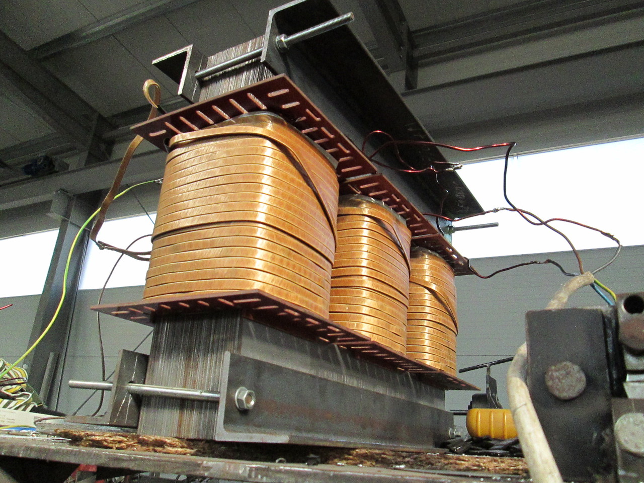 Terveim szerint ma kellet volna a trafót 100 (meg talán 110)%-al megterhelni, de egyszerűen nem értem oda a bolondokháza miatt... én is "jól bele passzolok"... Addig is néhány kép a "JÖVŐ REMÉNYSÉGE" type transzformátorról. Gyönyörűen látszik, hogy a primerből semmi sem látszik, biztos jó lesz a hűtése a 3 mm textilbakelit csévetesten keresztül... Ami nagyon érdekelne, az üresjárási áramfelvétel. Emlékeim szerint a 200A-es HETRA a max 5kW teljesítményével, kb 40 kg vasával üresben 1A körül volt. Köszi; Tambi