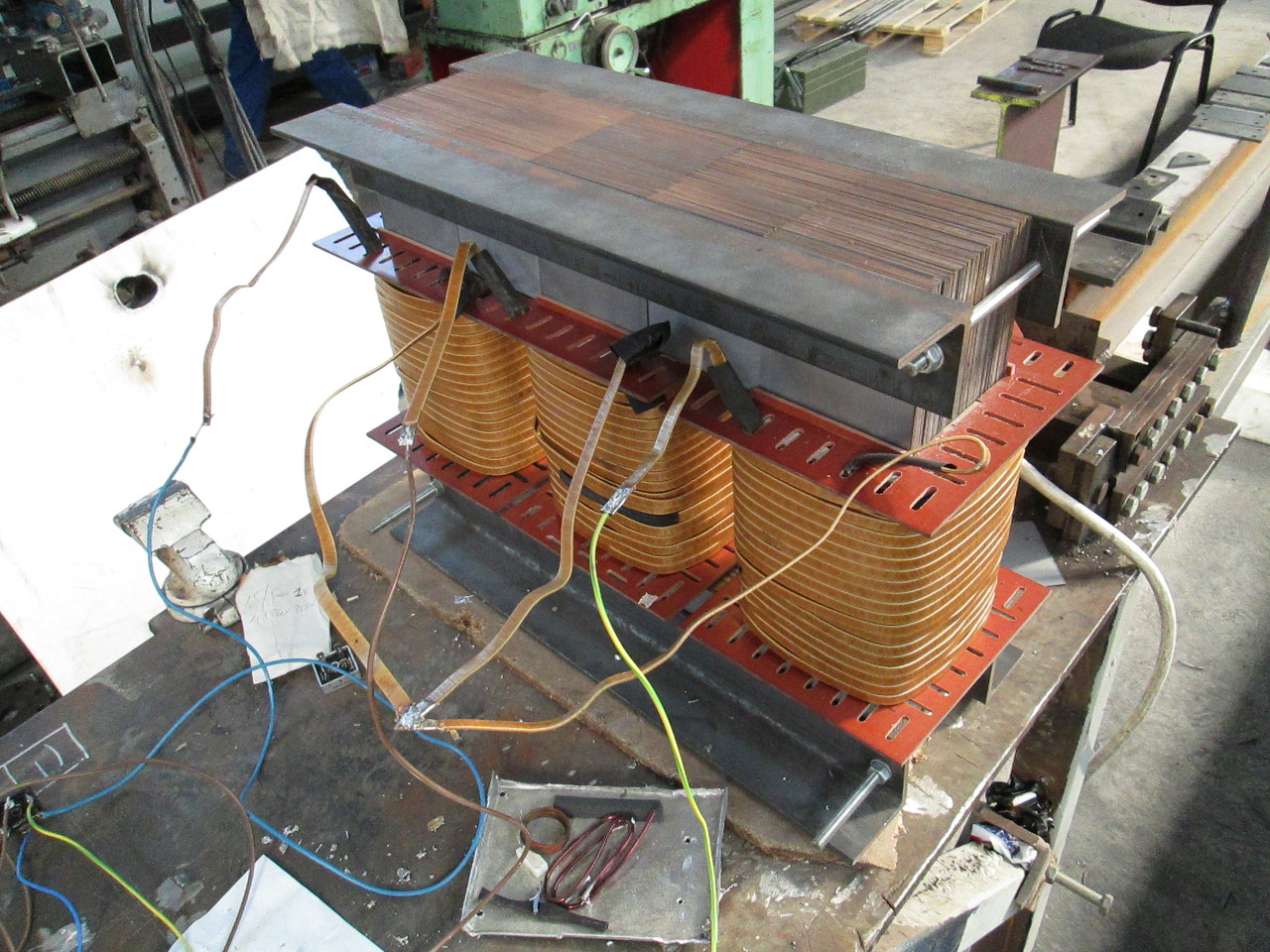 Itt a fotó. Beméretezni nem volt időm, de ha kell, valamikor a héten azt is megejtem. Az üresjárási feszültsége adattábla szerint 275V, mérve 288V . Most kissé szűkében vagyok a szabadidőnek, de ha lesz fél óra "lógós" időm, akkor leméretezem a trafó vasat és a fázisonkénti feszültséget is megmérem.