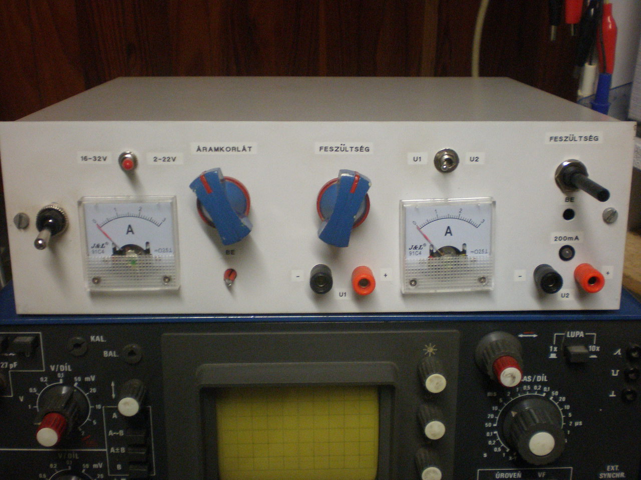 A hét elején befejeztem a labortápomat. Köszönöm a segítséget mindenkinek, aki a labortápos témában segített. Külön köszönet Prolinak. A táp 2-32V-ig állítható két lépésben. 23mA-től állítható az áramkorlát, 3A-ig. A dobozba került be még egy kis tápegység, a kimeneti feszültség állítható, de nincs benne áramkorlátozás, sem zárlatvédelem. A jobb oldali műszer feszültséget mér, csak még nincs átskálázva. A doboz egy mini számítógép háza, aminek új előlapot készítettem. Először festettem előlapot festőpisztollyal, egyszer le is kellett csiszolni, mert nem lett szép (megfolyt és felhólyagzott a festés). A két üres furatból két kis karos kapcsoló hiányzik, ezek majd be lesznek építve amikor következőnek rendelek alkatrészeket (most nem volt itthon). A feliratokat apám nyomtatta Dymo címkére (ezekkel feliratozzák az elosztószekrényeket illetve a szekrényekben az alkatrészeket).