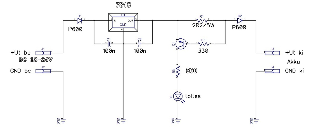 Ilyen esetre, mikor viszonylag sok akku van sorbakötve, és ezek ellenőrzése macerás, de a balanszírozása is, akkor az akkukkal párhuzamos Z-dióda 14,4V körülire ami átveszi a töltőáramot. ezért nem engedi túltöltődni. Mivel jellemzően nem kapható pontosan ilyen feszültségű, ami kellő teljesítményű lenne, ezért egy helyettesítő műkapcsolást kellene építeni ami már kielégíthetné a teljesítmény igényt. Bár, lehet talán kapni ZX sorozatból olyan diódát mely megfelelne, de félő, hogy a 12.5Watt teljesítmény kevés lehet. Ezt a műkapcsolást, ami helyettesíti a Z-diódát, ki lehet egészíteni egy leddel, ami a csurig töltött állapotot jelezhetné. Ha ez a led egy optócsatoló ledje lenne, akkor az összes akku teletöltődését is lehetne automatikusan indikálni és leállítani a töltést. A műkapcsolás emlékeim szerint egy teljesítmény darlington-tranzisztor és egy TL431 alkalmazásából meg a beállító trimmerből áll. Valahol fenn van az oldalon is.