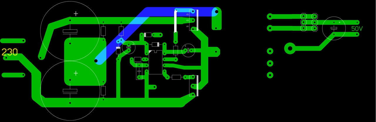 Szia! Az első dolog ami szembetűnik a nyákon azaz, hogy nincs meg a primer és a szekunder között a megfelelő szigetelési távolság! Az alsó Fet re menő táp nagyon közel van a kimenethez!