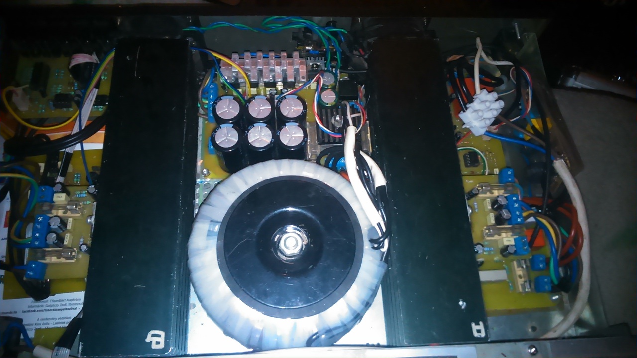 Azt hiszem eljött az ideje hogy én is gazdagítsam ezt a topikot. A házikó amiben lakik original, egy halott Watson 8170-A-é volt. Balról jobbra haladva: Bal oldalon a hanggal kapcsolatos szekció: IC-s bemenetválasztó (BSS féle, de itt javították a hozzáértők), hangerő hangszín modul (Alkotó-féle), majd felettük egy reloop-féle TDA7294-es blokk. Középen található a trafó (kb320VA), és a táp (6x4700uF). Jobb szélen az "energetikai" szekció: védelmi áramkör, egy szűrő és kicsit elbujva a lágyindító, felette is egy TDA7294-es blokk. A ketyere aktív hűtésű, stabilizált 5V-ról hajtja a 12V-os ventillátorokat. Itt megjegyzem, hogy venti nélkül sem lenne semmi baj, mert akkora borda van beépítve, hogy 2x2 blokkot is elbírna.