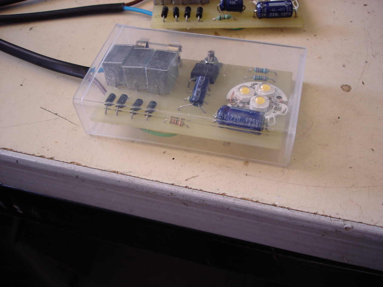 Itt egy világítás, ez csak egy db 3 W-os LED-et hajt ( 1 W körül, eresz alá, szarufára, bőven elég ) nagy tik-takkos dobozba van beépítve. ( Azóta már lefestve.)