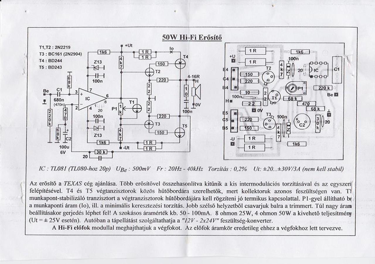 Megépítetted?? A legelső kapcsolás erről a szörnyről már az első, 1978-as első kiadásban megjelent. Tip33-34A véggel. 4-16 ohm lezárással, +/-15-30V tápfesszel. 5 sor leírással. Később - pusztán a műszaki paraméterek bűvöletében- elterjedt. Mint a városi legendák. Sokan építhették meg változó sikerrel, nekem mindhárom változat megadta magát, 1-55 nap alatt, váratlanul. Ugyanis én háromszor próbáltam megépíteni, a 80-as években, az akkor még kapható eredeti félvezető készlettel. Mindenkit lebeszélek. Biztos van bevált recept erre a kapcsolásra, ötleteléseken felül valaki írhatna egy megbízható receptet/cikket ehhez a kapcsoláshoz. Amit bárki utánépít, jól is szól, és MEGBÍZHATÓ. Hajrá!