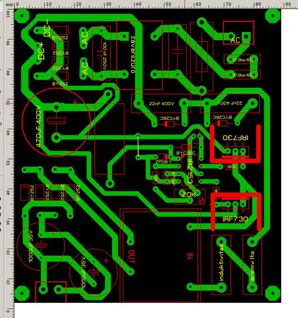 Szia! Az első dolog ami szembetűnik a nyákon azaz, hogy nincs meg a primer és a szekunder között a megfelelő szigetelési távolság! Az alsó Fet re menő táp nagyon közel van a kimenethez!