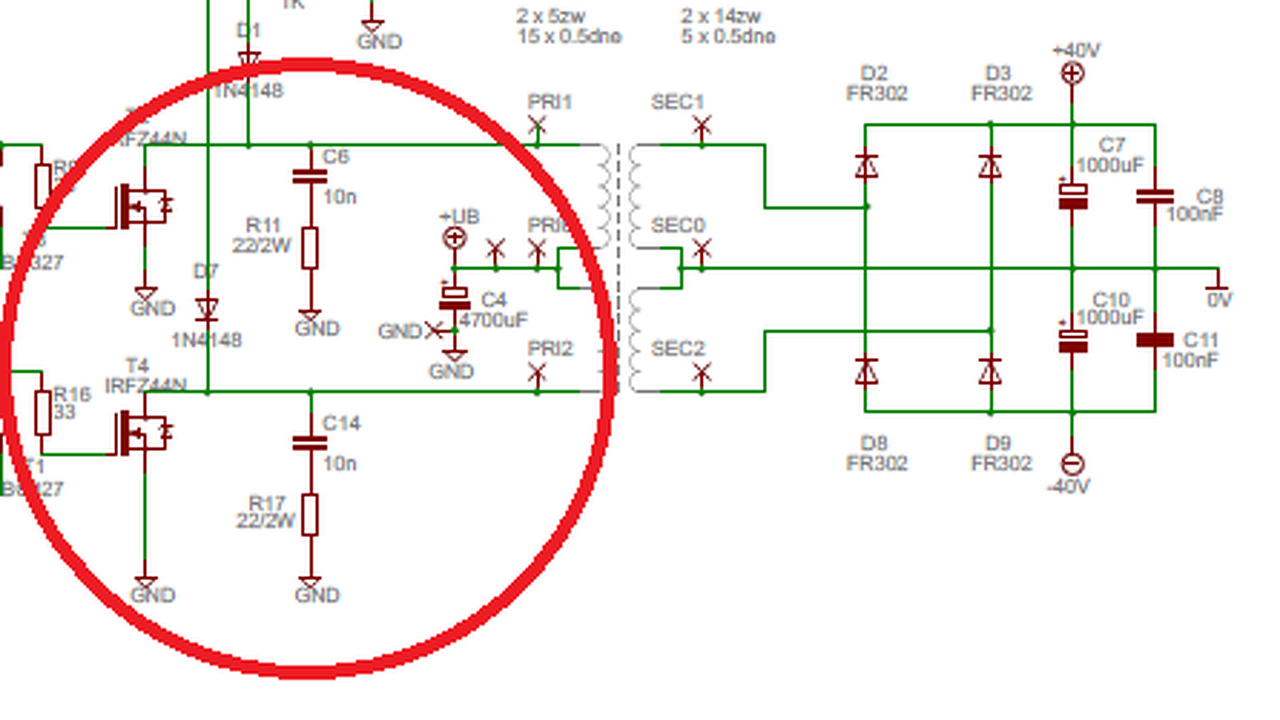 Igen . De majd az egyenirányitó diódák elé se felejcsd el betenni. 100n 100V és 100 Ohm 1W-os. Amennyiben szimetria táp lesz ne a Gdn-re hanem a két szekunder ágat kösd össze vele.