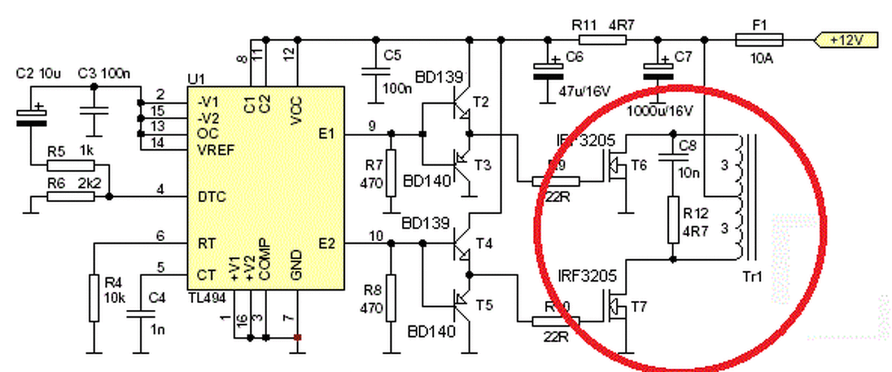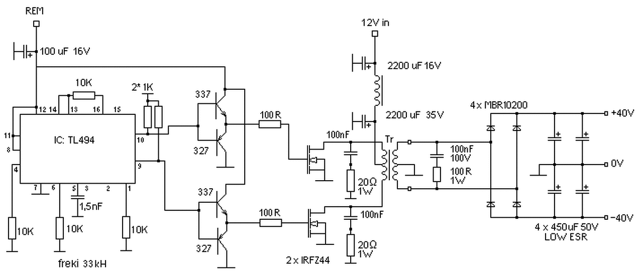 Első ránézésre annyi gondom van vele, hogy ha párhuzamosan használod a kimeneti tranzisztorokat, akkor a CTRL(13. láb) nem REF-re, hanem földre kell kötni. (lsd. TL494 adatlap).