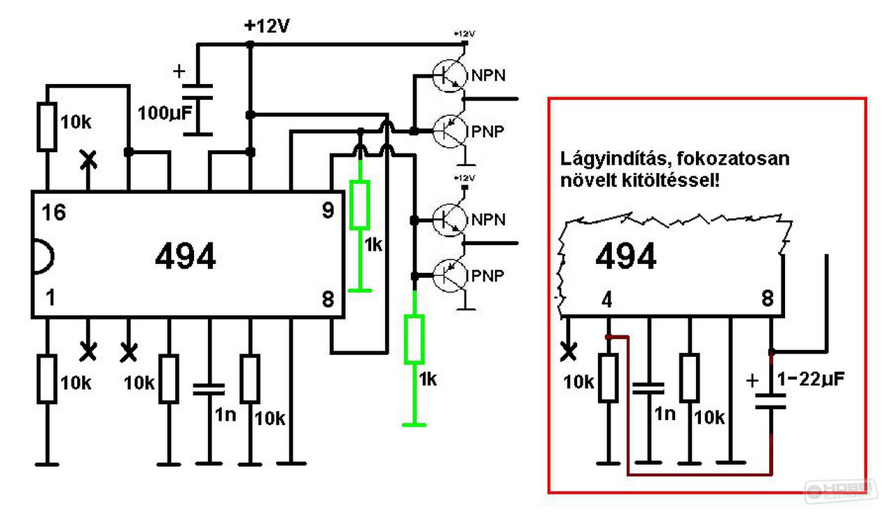 Remélem ezt így ebben a formában nem megépíteni szeretnéd. Már a rajz sem jó. Ha a hibaerősítőket nem használod akkor fixre kell kötni, ellenkező esetben egy kósza néhány mV-os jel érdekes dolgokat fog csinálni a levegőben lógó lábbal. Tehát az 1-16 lábakat a földre kell kötni, a 2-15-ös lábakat pedig a Vref-re. A másik, hogy a komplementer emitterkövető elég nagy árammal töltögeti (illetve kellene töltögetnie de nem tudja mert 100 ohmokat tettél oda, ahova max 22 ohmot kellene) a fetek gate-jét, tehát annak a tápfeszét nem a remote-ról kell levenni hanem az akkufeszből. Sőt az IC tápfeszét is az akkufeszből kell elvinni, a remote szál csak engedélyezi vagy tiltja az órajelet, mondjuk a DTC lábon. A fetek gyors ki-be kapcsolásához nagyon nagy a 100 ohmos gate ellenállás, de ezt már leírtam. Ebből így elég gyorsan füst lesz.