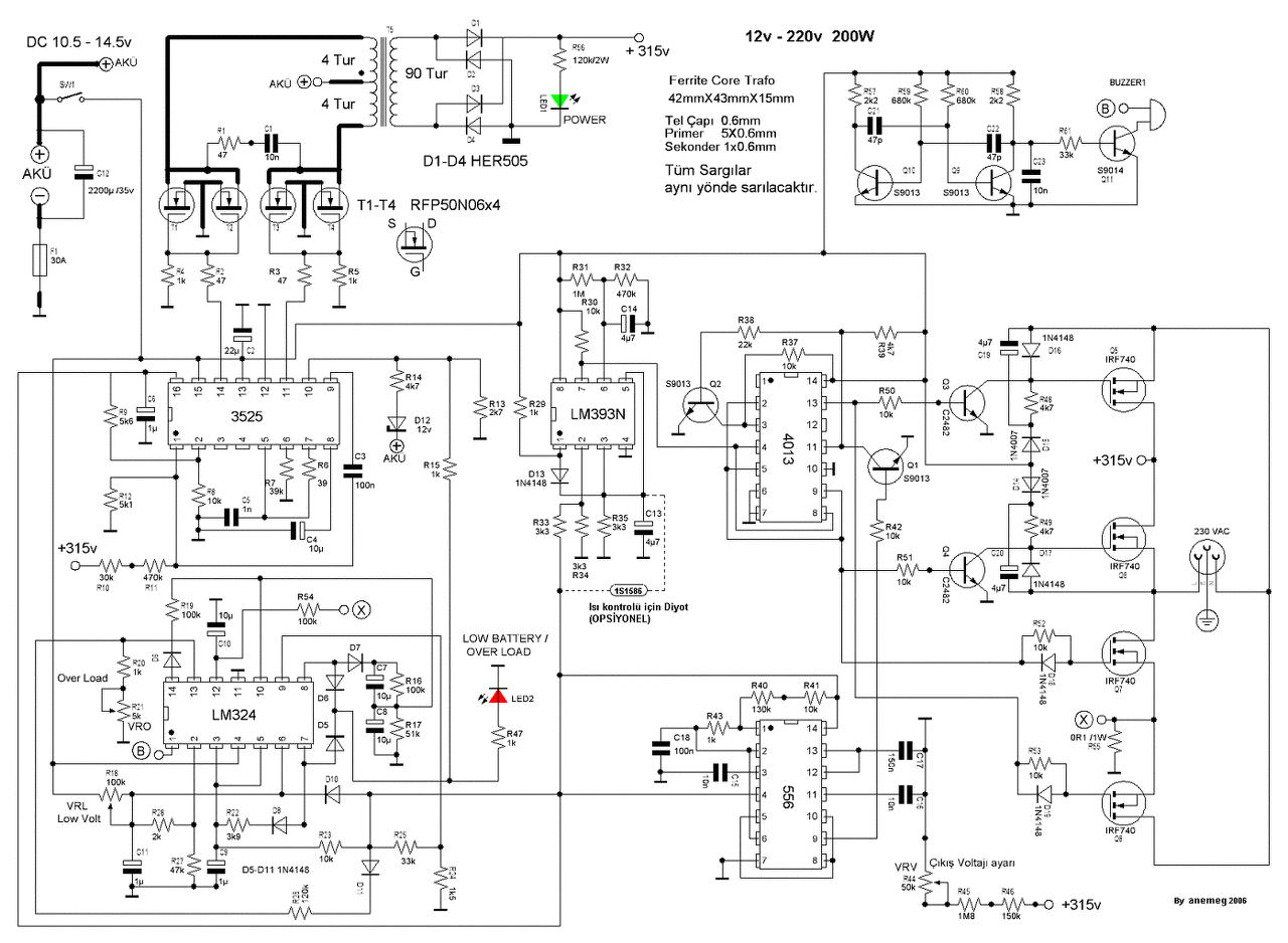 Szia! Az egyik vezérlő (primer) 12(24)V-ból csinál kb.300V DC-t változóan 20-40KHz frekin. A másik vezérlő 50Hz-el vezérli a képen látható 4db TO220 Fet-et, amik teljes hídban üzemelnek 300V-on. Szinte bármilyen gyártmányú IRF740-nek megfelelő tranyóval helyettesíthető. Először nézd meg, hogy a 300V-ot előállítja-e, ha nem akkor itt nézd meg a két Fet-jét jók-e, ill kapnak-e vezérlést Sokszor a 2200uF(néhány példányban 1000uF) hiánya/kiszáradása szüretlenség miatt el sem indul a primer oldal. A másik kört ugyanezzel a logikával ellenőrizd... Vigyázat (!!!) mert nagyfeszültség van benne és komoly balesetet okozhat! Zömében a nagyfesz diodák és a kimeneti (híd) tranzisztorok miatt áll meg. Google-val találsz rajzokat is...