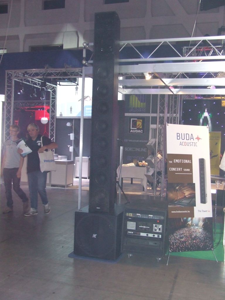 Ez már sokkal kényesebb, és nagy érdeklődéssel várom a véleményeket, nézeteket. Mostanában építek egy 2.1-es hangszóró rendszert, aminek kapcsán jelentős mennyiségű hangszóró doboz méretezési elméletet olvastam át (több 100 oldalról van szó). Ebben tárgyaltak számos paramétert, elvet, voltak iránymutatások, és kimagaslóan a legtöbbet arról olvastam, miért nem lesz jó, akármilyen dobozt is készítek. De nagyjából mégis egységes dolgokkal találkoztam hangszóró doboz térfogatok kapcsán, illetve azok mélységével kapcsolatban, illetve minden ajánlás igyekszik lehetőleg egymáshoz közel tenni a sugárzókat, igyekezve azokat egy pontba zsúfolni. Nos a kiállításon ennek még nyomát sem láttam, de ellenpéldákat nagy tömegben. Mi lehet az oka az alábbi felépítéseknek? Miért jó az, ha egy valamilyen SUB tetejére zászlórúdként egymás fölé kerül egy csomó hangszóró? Több olyan is volt, ahol a zászlórúd valójában kb. 7-8 cm átmérőjű lehetett. És ami a lényeg, a képeken lévő applikációk éppen szóltak is, és egyáltalán nem volt pocsék. Ami egyedüliként látszik a képen (ez egy vaskosabb torony volt), kimondottan jól szól, de legalábbis nagyságrendekkel jobban mint amiket a színpados részeken lehetett hallani, és a hármas képkombináción lévő is egészen rendben volt hangilag. Komolyan el is szomorított, hogy egy hangtechnikai kiállításon nem hallottam olyan hangot, amire felkaptam volna a fejemet, de egy csomót hallottam amitől menekültem odébb.