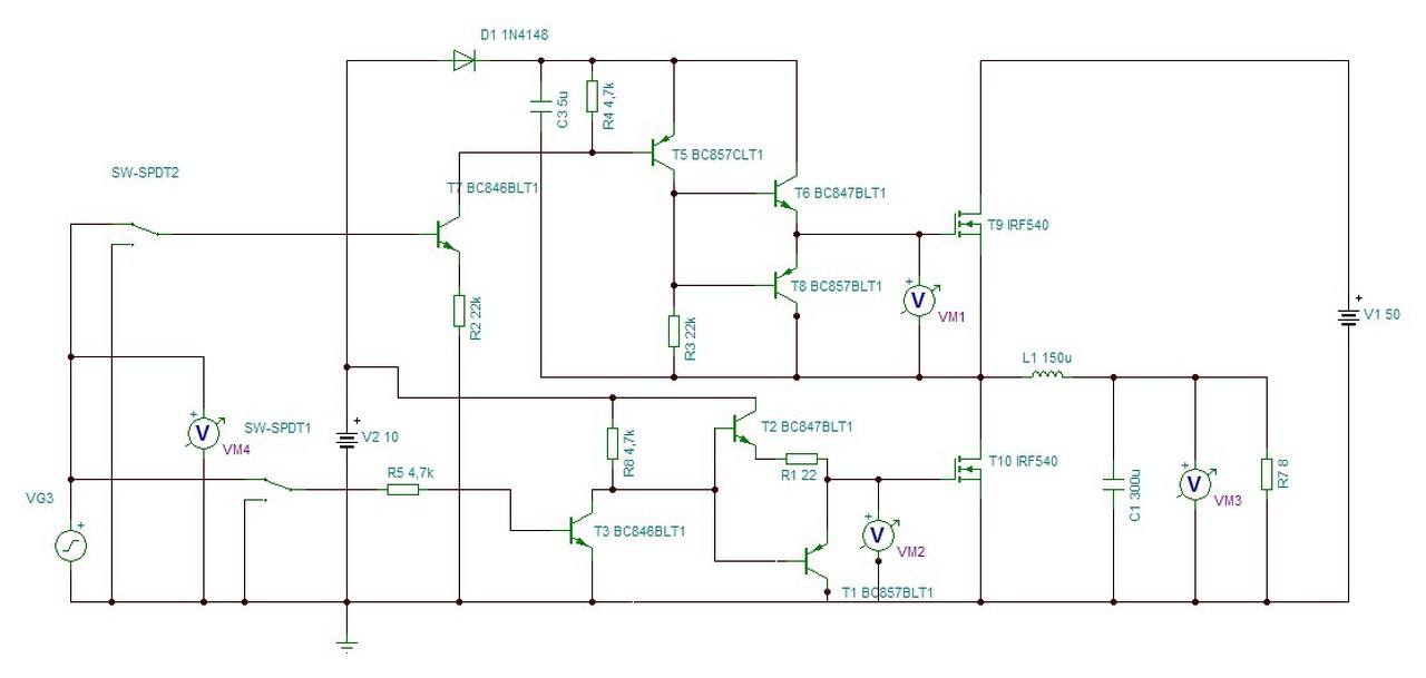 A fetek nagyjából azonos sebességű kapcsolásához célszerű lenne hasonló meghajtást kialakítani; Vagy ne legyen az alsó fet meghajtásnál az R1, vagy a felsőnél is legyen. Az emitter követők előtti meghajtók munkaellenállásai sem egyformák (22K, 4K7), és nem is azonos irányba dolgoznak. Esetleg ajánlom figyelmedbe, az NXP UcD erősítő fet meghajtását, az sem túl bonyolult. Bővebben: Link