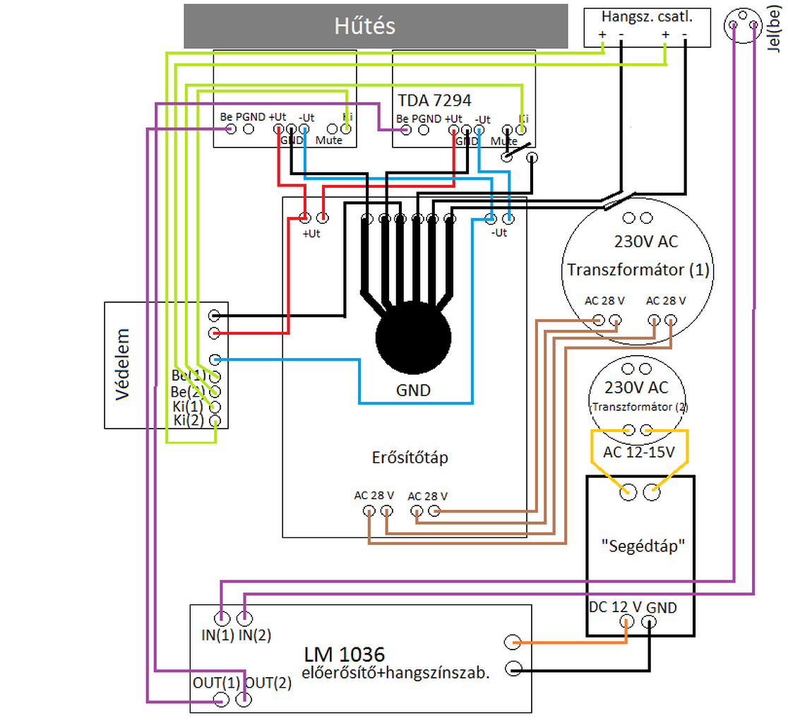 Lassan, de biztosan haladok a TDA 7294 sztereó erősítő projekttel. A mono prototípus már kész és működik is, a "teszteket" jól bírta az IC .Már csak a hangszóróvédelem és a hangszínszabályzó legyártása hiányzik és neki tudok kezdeni a dobozolásnak. Közben elkezdtem tervezni a dobozon belüli kialakítást (mivel már a panelméretek nagyjából megvannak), ám egy "apró" huzalozási probléma merült fel számomra. Mivel ilyen transzformátort használok majd a két végfok hajtására, ezért a hangszínszabályzónak (és a kivezérlésjelzőknek) a táplálását egy kisebb teljesítményű másik tanszformátorról oldanám meg. Egy esetleges földhurok okozta zúgást el szeretnék kerülni, ezért abban szeretnék kérni némi segítséget, hogy a rajz szerinti elrendezés földelését, pontosabban a jelföldet hogyan lehetne úgy "megoldani", hogy ez a probléma ne merüljön fel. A bemenő jelet árnyékolt vezetéken vinném persze, ám a rajzon ennek(valamint a két végfoknak) a földje nincs berajzolva, ugyanis számomra ez a kérdéses rész. A rajz azért sikerült ilyenre(egyrészt mert painttel csináltam ),másrészt mert ez nagyjából tükrözi a majdani házon belüli elrendezést. A hozzászólás módosítva: Okt 24, 2015