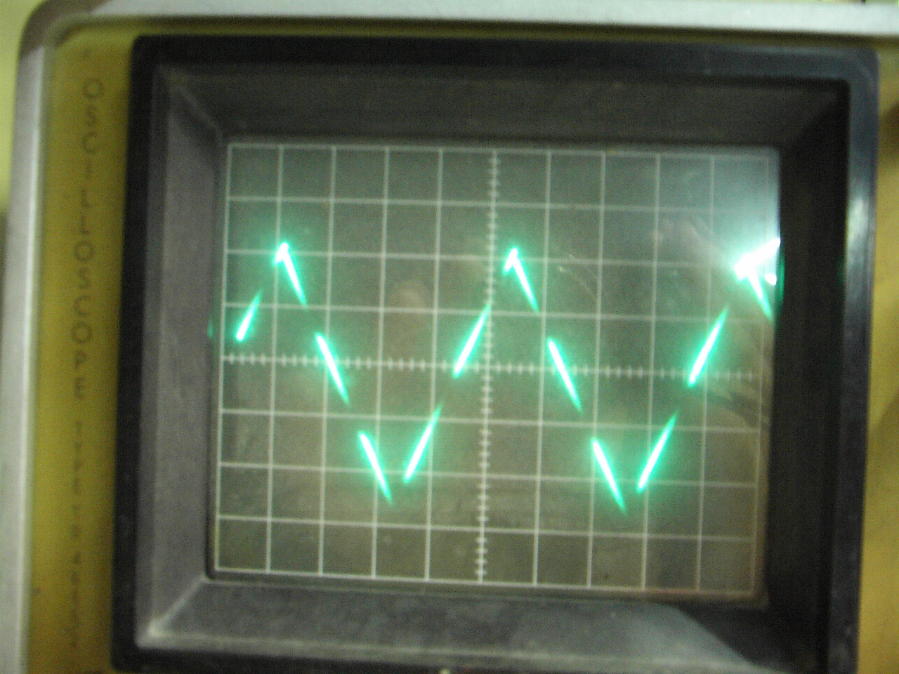 EMG1568/2 szkópom szaggatott jelet produkál, mintha Z moduláció lenne. Az alábbi ábrán egy kb. 100-110Hz-es háromszögjelen jelenik meg a kioltás, kb. 600Hz frekvenciával. GND-re kapcsolva szintén és mindkét csatornán produkálja. A fényerő poti változtatására a frekvenciája kissé változik. Van valakinek ötlete, hogy mi okozhatja? Sajnos az előéletéről semmit nem tudok, már így került hozzám.
