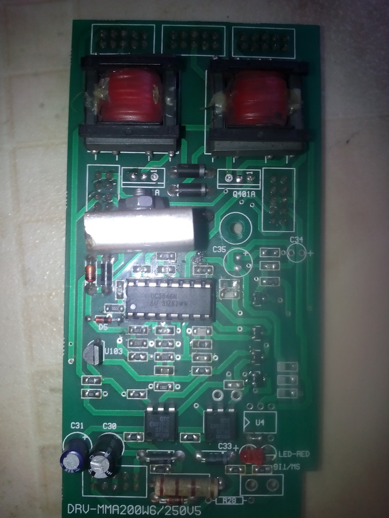 Csupán hogy befejezzem a megkezdett témámat,az inverteres hegesztő végül beindult. Mint az előzőkben is irtam,a fő diódahid,3drb 470µF/400V kondi,az UC3846 mellett mérések alapján bekalibráltam a hiányzó ellenállás értékét az UC 8-as lábán egy 18k ohmos ellenállással.Ekkor az UC kimenő lábain 29,8kHz lett.A biztonság kedvéért kicseréltem még az két IRF530N meghajtókat is.Összeraktam a gépet,természetesen az első próba 100W égőn keresztül történt,majd anélkül,és csak végül jött a pálcás próba.3 drb 3,25mm-es pálca egymás utáni elhegesztése nem okozott gondot.Remélem egy jó darabig menni is fog. Az inverter tipusa Walter W2200TIG(ezt irja a gépen),de a neten Walter atom200tig alatt található meg.