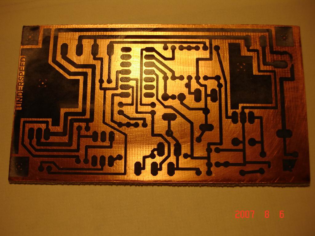 Sikerült végre a fotozásos technikával nyákot csinálni. :hehe: Persze ez csak egy prototipus ezért ez csak egy részlet, a kirpóbálásra. De ezt látni is lehet rajta... Leírom hogy csináltam: Lefújtam a nyákot Wolfos lakkal és egy öreg kenyérpirítóba (vízszintes, "francia piritós" fajta) gyorsan beraktam, ami már elő volt melegítve. Pár percet vártam (míg eléggé büdös nem lett ), aztán még hagytam egy picit száradgatni.Nah ez volt az amit eddig nem csináltam. Eddig nem használtam a kenyérpirítót, de most szép egyenletesen fényesen kötött meg a lakk. A többi végülis már mese, jah de ami fonots, hogy ezt a kis darabot kb. 2*3 cm-es egy darab 5 mm-es UV leddel világítottam kb. 10 percig, úgyhogy ez is átvilágítja rendesen, csak hát kevés és drága. Jah és H2O2-vel marattam. A képekért bocsi, csak webkam volt nálam, de mindenképp meg akartam mutatni!!! Nekem tetszik. Van benne pár apróbb hiba, de funkcionálisan mindenhol tökéletes (nincs szakadás stb.)