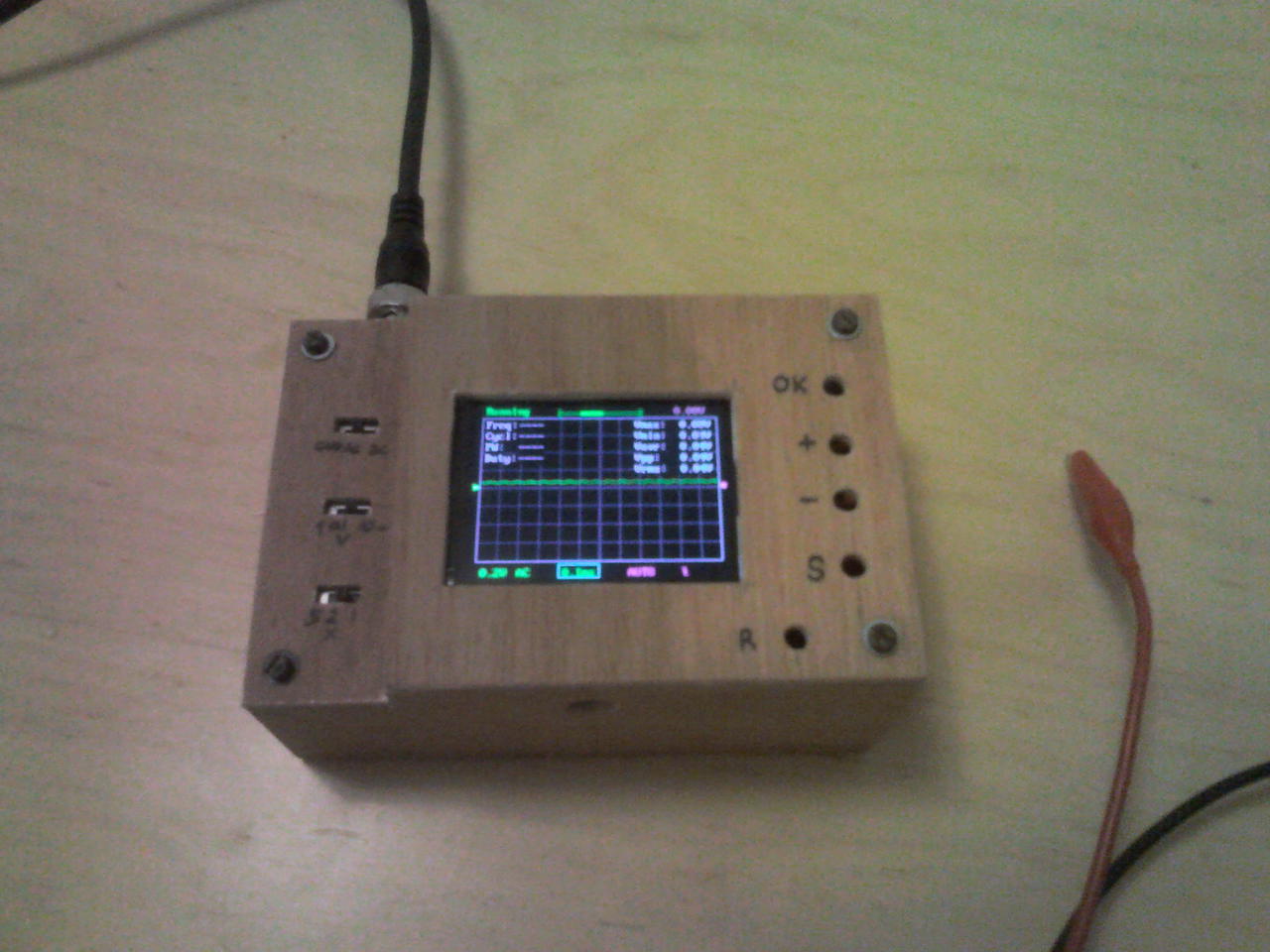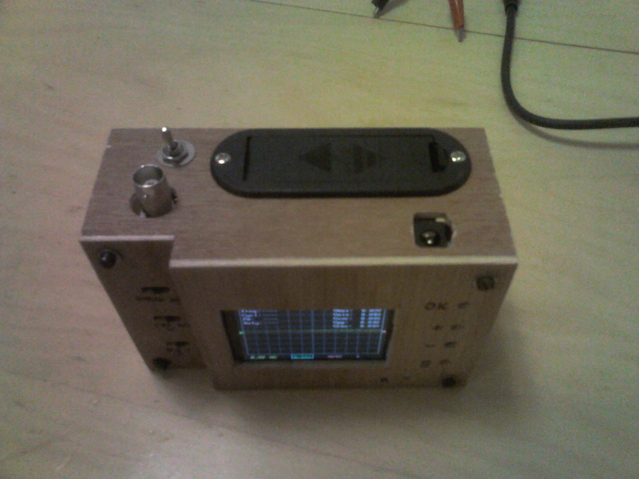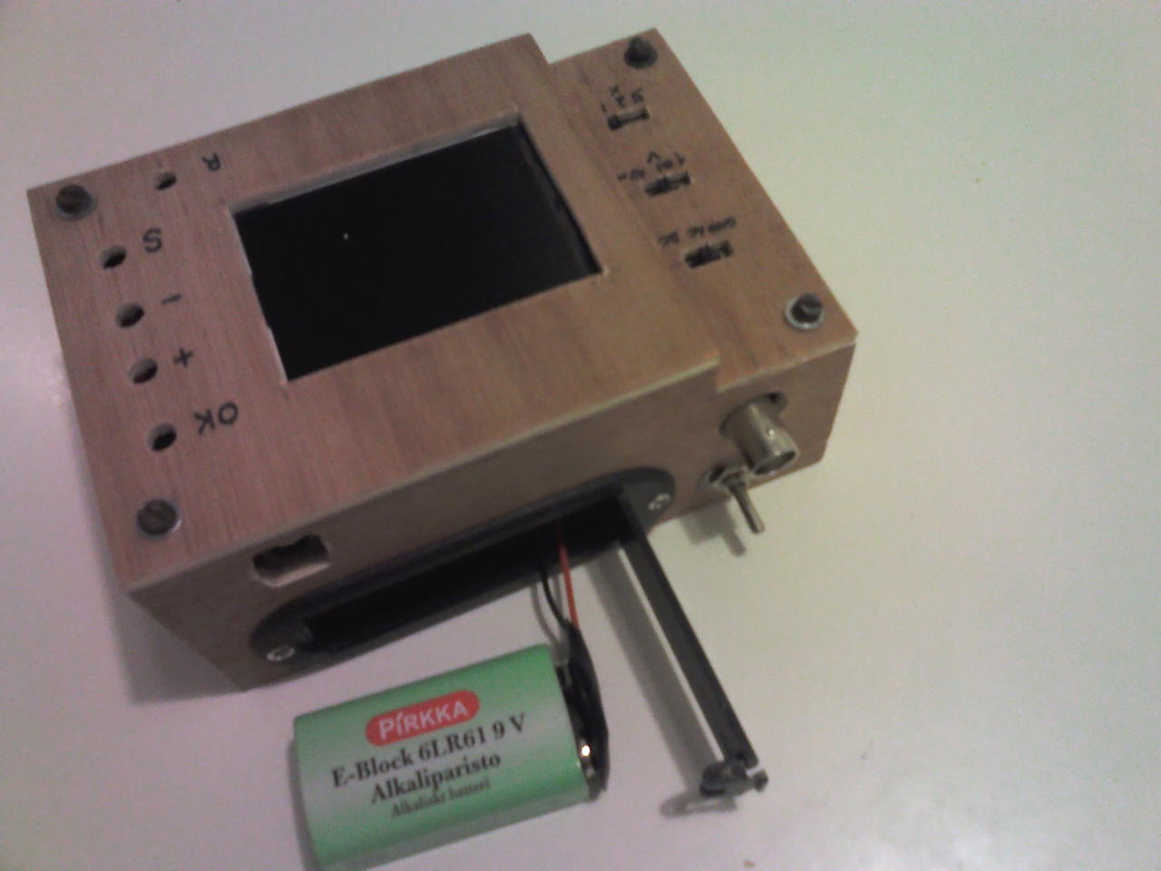 Ma bedobozoltam a DSO138 Oszcilloszkópot. A famunka elég távol áll tőlem. A kábelcsatlakozót fordítva forrasztottam be, így egyszerűbb volt a dobozolás. Rendeltem hosszú szárú nyomógombokat (ebay). Az még hiányzik. A feliratozás nem a legszebb, de nekem jó. Egy TDA7293-al teszteltem, ami +-33v-ot kap.