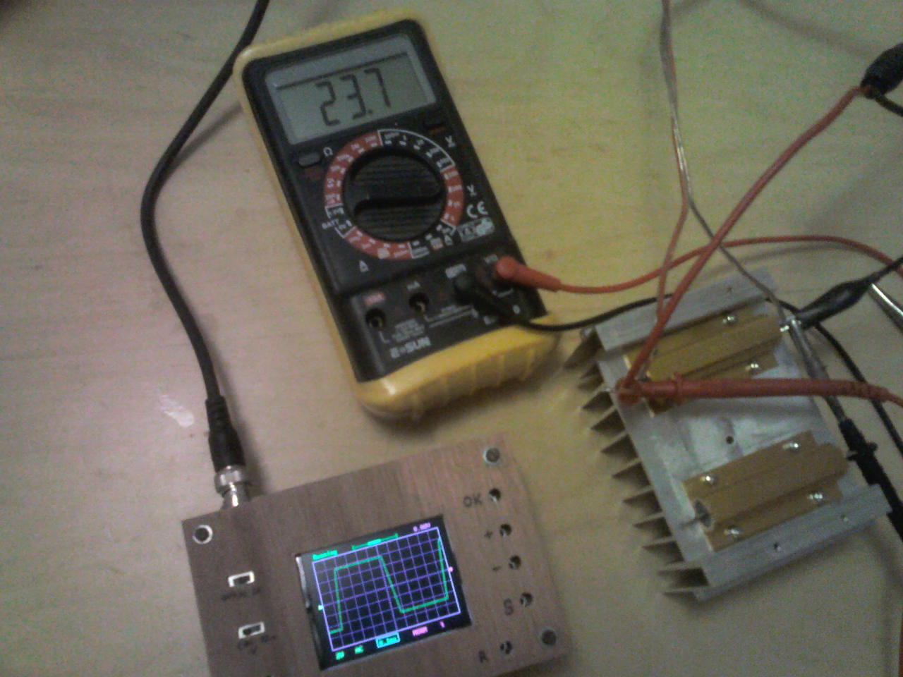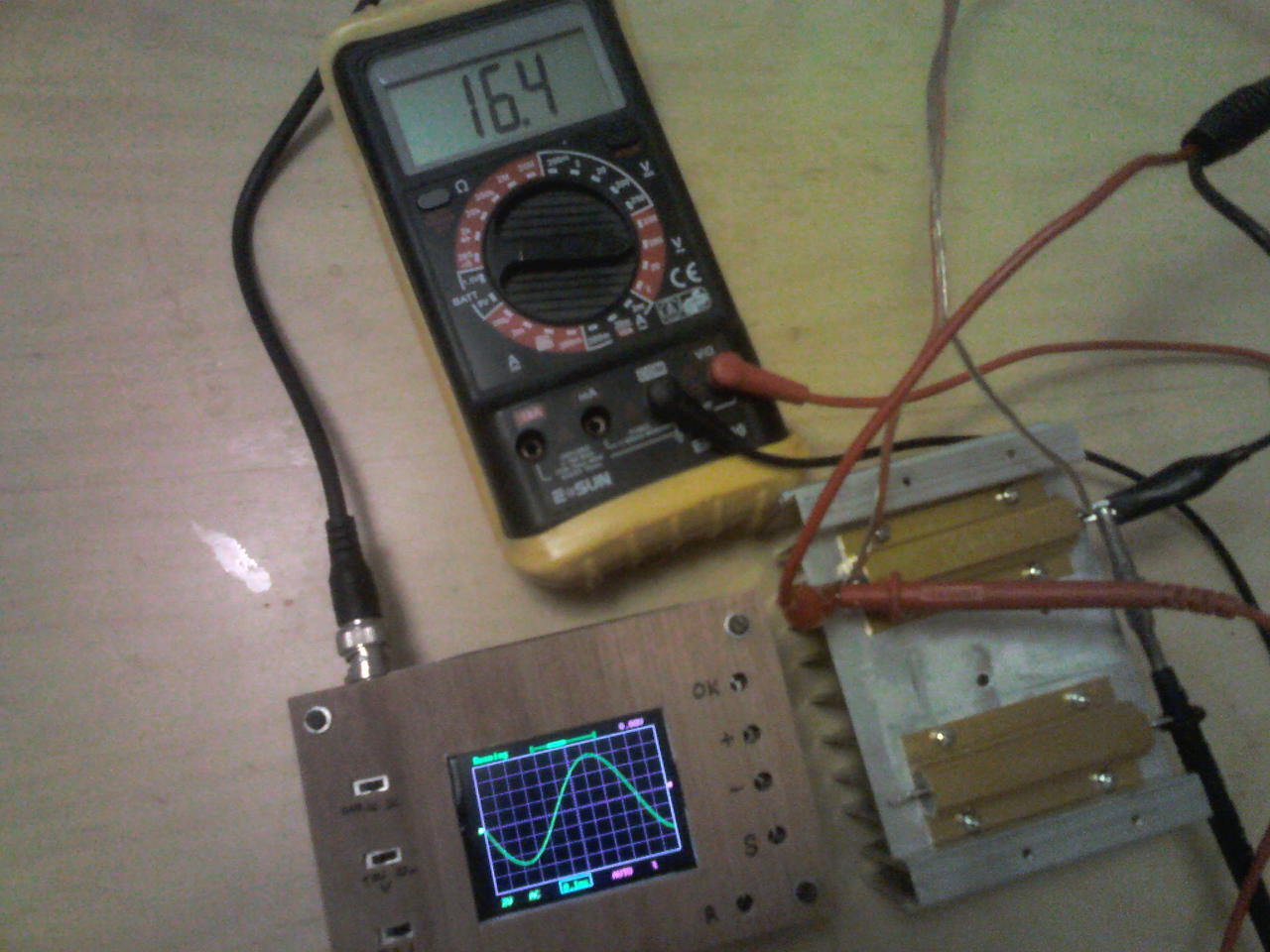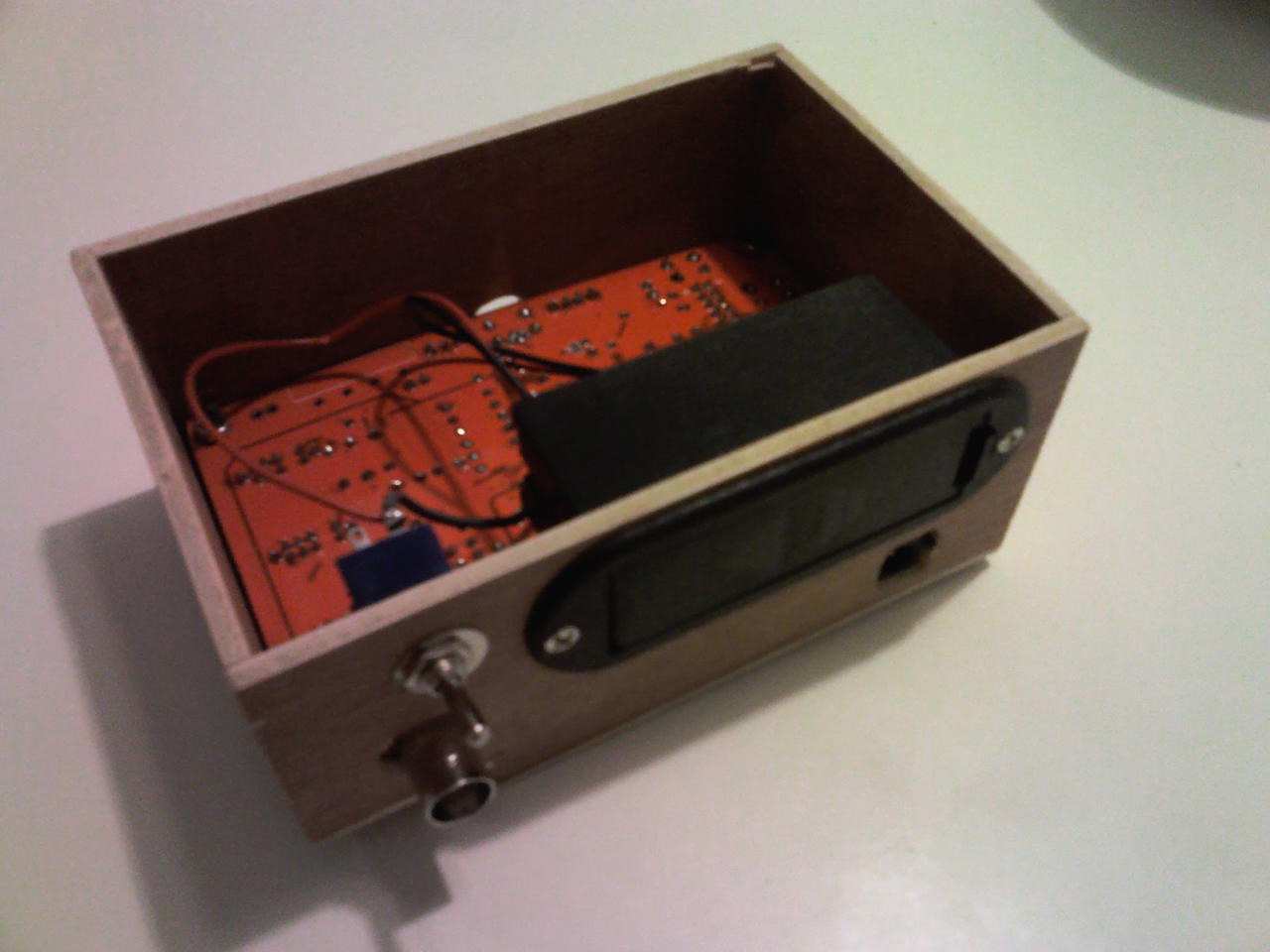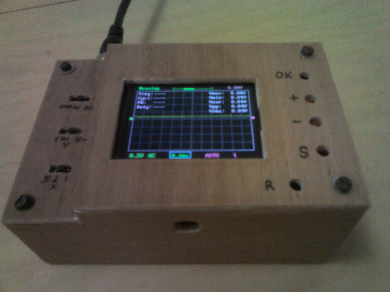 Ma bedobozoltam a DSO138 Oszcilloszkópot. A famunka elég távol áll tőlem. A kábelcsatlakozót fordítva forrasztottam be, így egyszerűbb volt a dobozolás. Rendeltem hosszú szárú nyomógombokat (ebay). Az még hiányzik. A feliratozás nem a legszebb, de nekem jó. Egy TDA7293-al teszteltem, ami +-33v-ot kap.