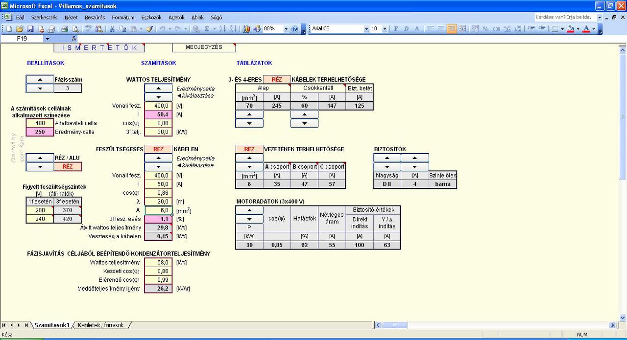 Kábel méretezés eredménye Megadott adatok a számításhoz: Megengedett %-os feszültségesés: 3% Hálózat típusa: 3x400/230V - (5 vezetős (3P+N+PE) asszimetrikusan terhelt 3 fázisú) Fogyasztó berendezés jellege: motorikus Fogyasztó berendezés feszültsége: 3x400V háromfázisú Fogyasztó berendezés hatásos teljesítménye: 30000 Watt Jellemző teljesítmény tényező [cosj]: 0.9 Kábel anyaga: Réz Kábel hossza: 20 méter Számított értékek: Mértékadó feszültségesés értéke: 5.2 V Berendezés villamos teljesítménye: 32608.7 Watt (32.6087kW) Berendezés által felvett áram: 52.3 Amper Számított kábel keresztmetszet: 3.59 mm2 Választott kábel keresztmetszet: 4 mm2 Réz kábel A 4mm2-es kábel 52A mellett biztosan nem jó melegedésre, de holnapra kiderítem, hogy mi a pontos feladat, szerelési mód stb. Köszönöm a segítséget mindenkitől!