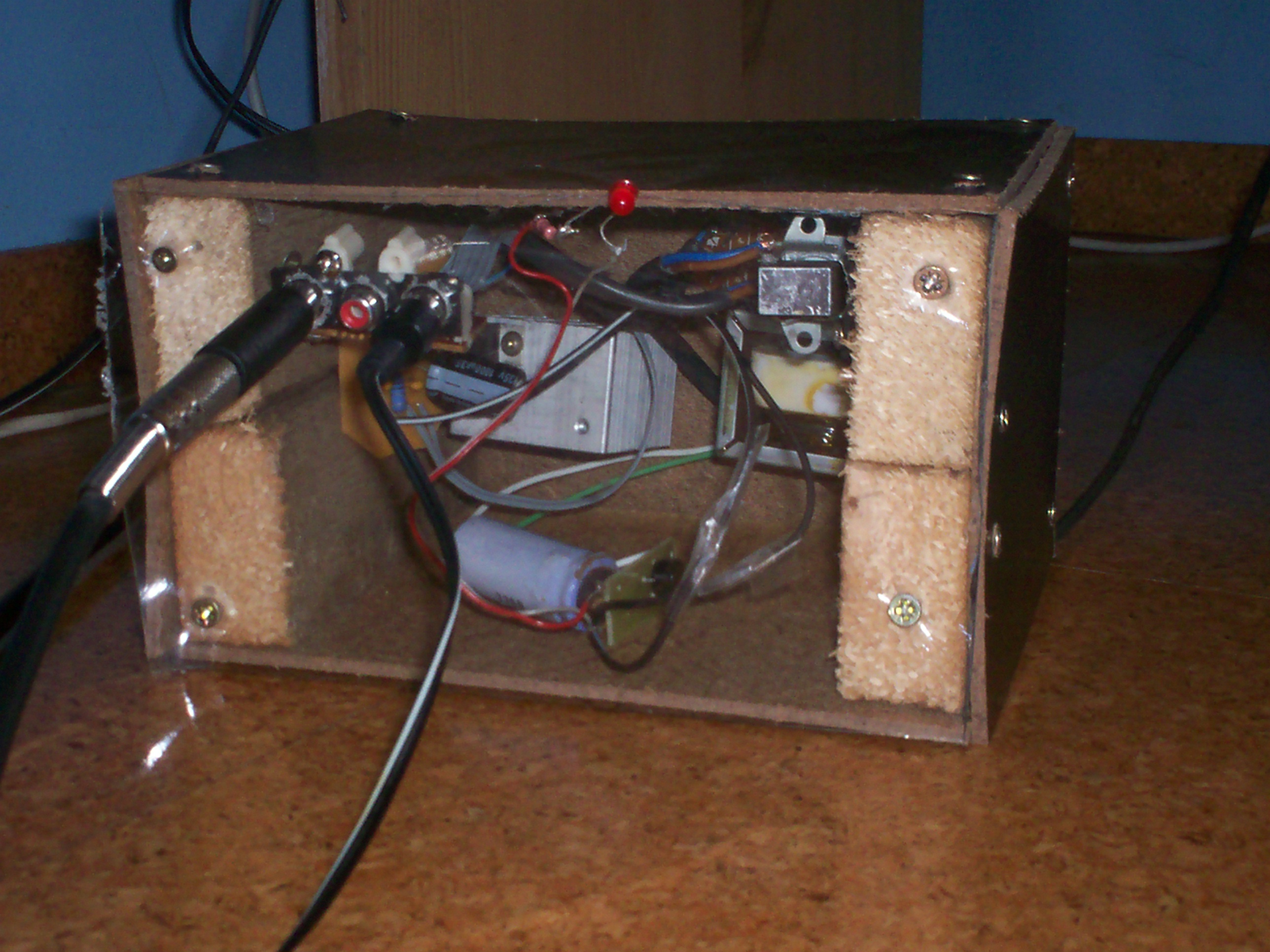 Csináltam egy minierősítőt itthonra, gitárt erősítek vele. TDA2003-as ic van bemme, 6W-ot tud (asszem 8ohmon). Dogozát fából csináltam azért néz ki így Akarok még bele tenni belsővilágítást, hogy szép legyen. A trafója kicsit kicsi, nagy hangerőnél torzít