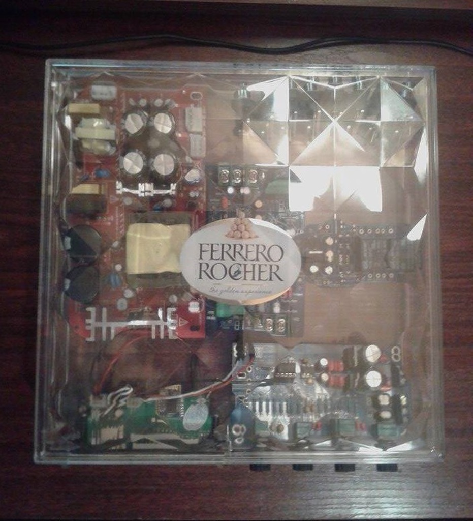 Ebbe a ferrerósba szeretnéd? Mert szerintem felejtsd el. Pl hűtőbordát se látok, bár bele se férne amilyen jó lenne rá. Hátulján az a sok rca bemenet kenne? Bemenetváltó mi lesz benne?