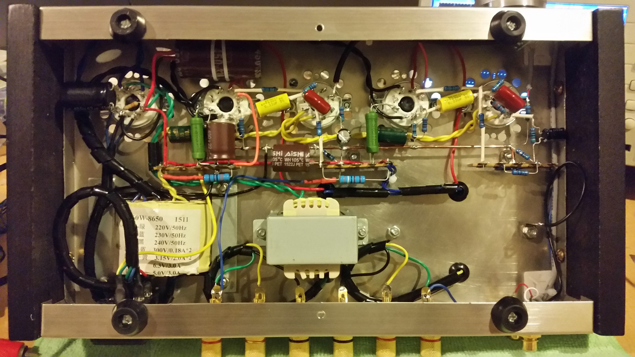 Pár észrevételt írnék, ha megengeded. Gitárhoz ennek a kapcsolásnak nagyon kevés az érzékenysége. Szükség lesz még egy fokozatra a bemeneten. Az EZ80 egy ellenütemű végfokhoz kevés, cseréld le EZ81-re. A huzalozás sajnos egyáltalán nem jó. Próbáld meg az alkatrészeket közvetlenül a csőfoglalatok lábaira kötni, minél rövidebb lábakkal. Ez így nem csoda, hogy gerjed, zúg. Példának itt egy kép, cua fórumtársunk erősítőjének a belsejéről: Bővebben: Link