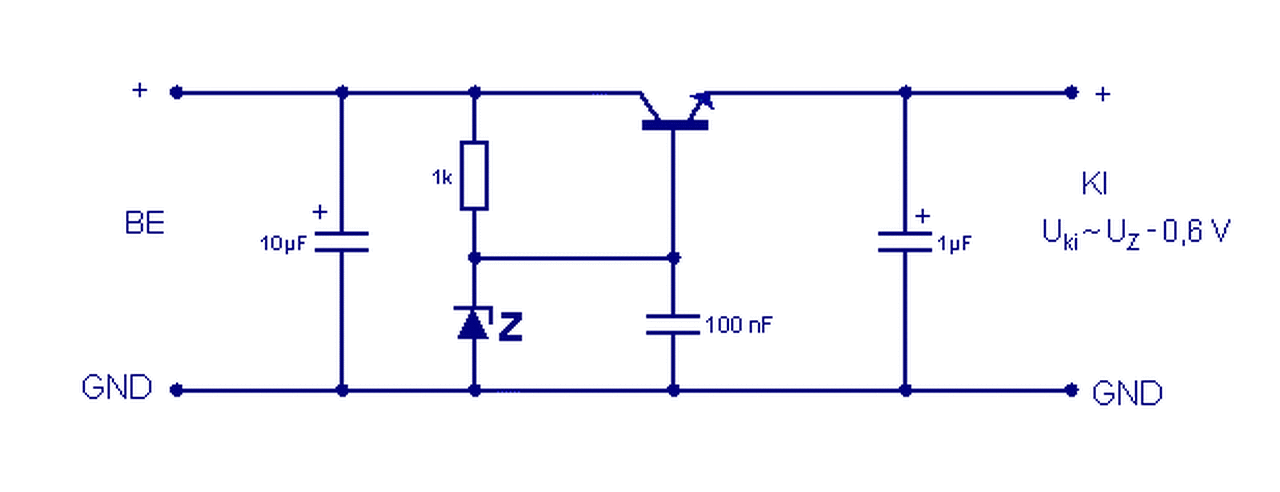 A zener felett lévő 1 kohm-ot úgy kell megválasztani, variálni, hogy a diódán egyszer átfolyjon kb. 4-5 mA, másrészt egyidejűleg a tranzisztornak szükséges bázisáram is maradjon.