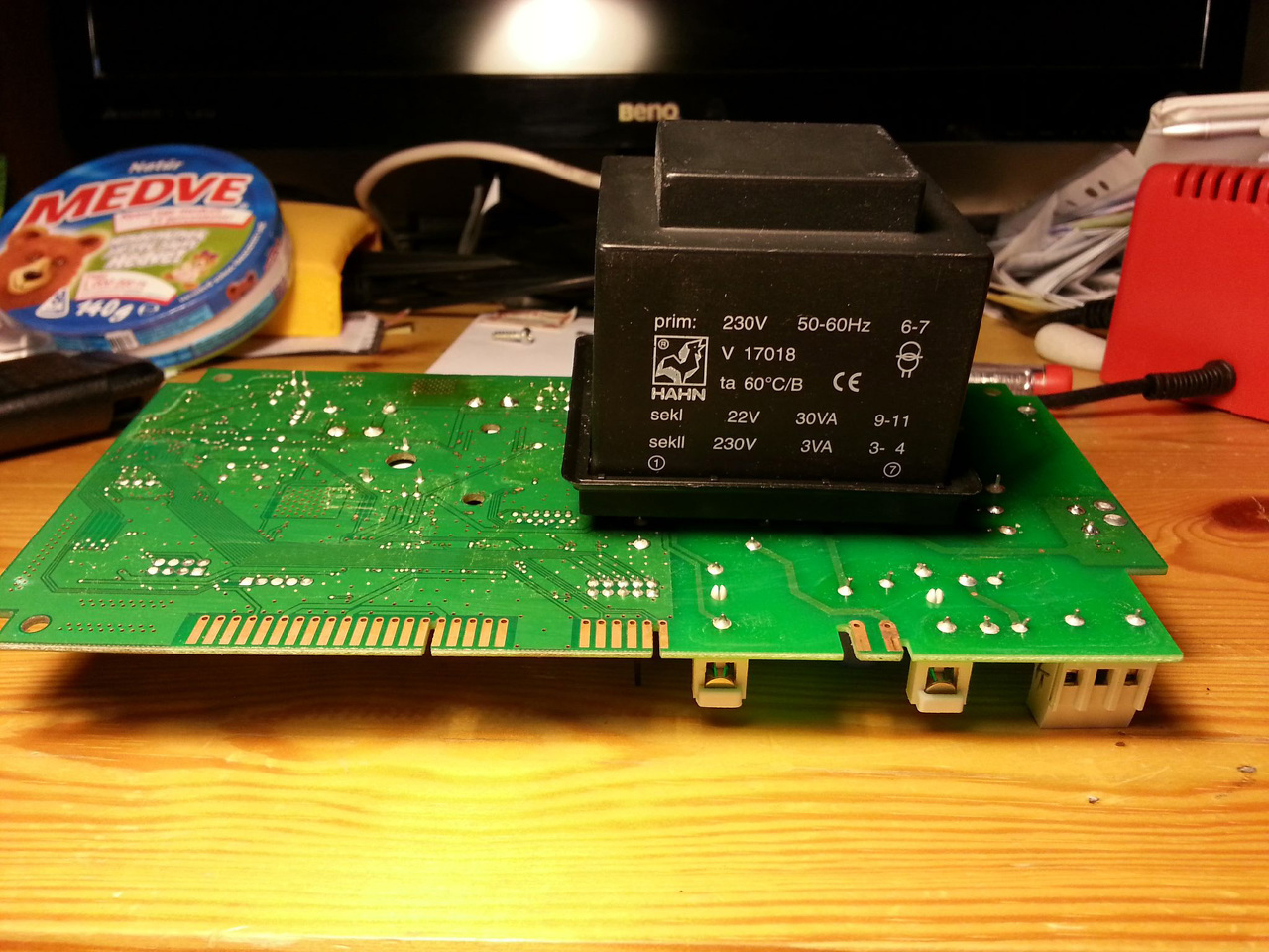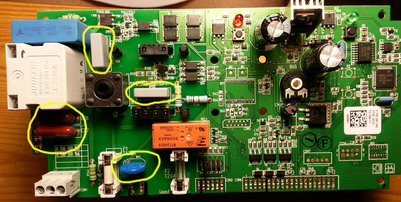 Kaptam már több e-mail-t is egy teljesen azonos hibajelenséggel kapcsolatban ami kifejezetten a Bosch gyártmányú Therm 4000S típusú turbós gáz vízmelegítőt érinti. Ezzel a hibával már 3 szerelő próbálkozott nálunk, többek között a Bosch hivatalos szervízese is minden eredmény nélkül. Illetve úgy meg tudták volna oldani hogy az egész elektronikát cserélik (70.000-90.000 Ft-ért). Nekem sikerült megoldanom kb. 1000 Ft-ból. Tehát: Mellékeltem a képeket, sárgával bekarikáztam azt a 4 kondit amit kicseréltem és rosszak voltak. A három elektrolit kondit is kicseréltem, de utólagos méréssel kiderült, hogy azok jók (érdekes, meg mertem volna rá esküdni, hogy azok lesznek a rosszak). Valamint a kék egy varisztor az "szűri" az elszívóventilátor "zaját". Valószínű az volt a baj fő okozója, a saját ventilátora zavarta. A fesz stabilizáló IC ha jól emlékszem 7824, ami a hűtőbordán van, az volt az első próbálkozásom, kicseréltem és hűtőbordára tettem, eredetileg rá van forrasztva a nyákra és valószínű kicsit már meg is barnította a nyákot mindenkinek mert gyárilag hűtőborda nélkül van (no comment). De mint utóbb kiderült annak nem volt baja. Mellékeltem még egy képet a vízmelegítő típusáról és egy képet a trafóról azt csak le kell húzni róla, ki lehet venni és akkor könnyebb szerelni. A varisztorból nem kaptam pont olyat mint amilyen benne volt, kisebb "lekapcsolási" feszültségűt tettem bele, de tökéletesen működik legalább hamarabb "határol". Ha kérdés van szívesen válaszolok!